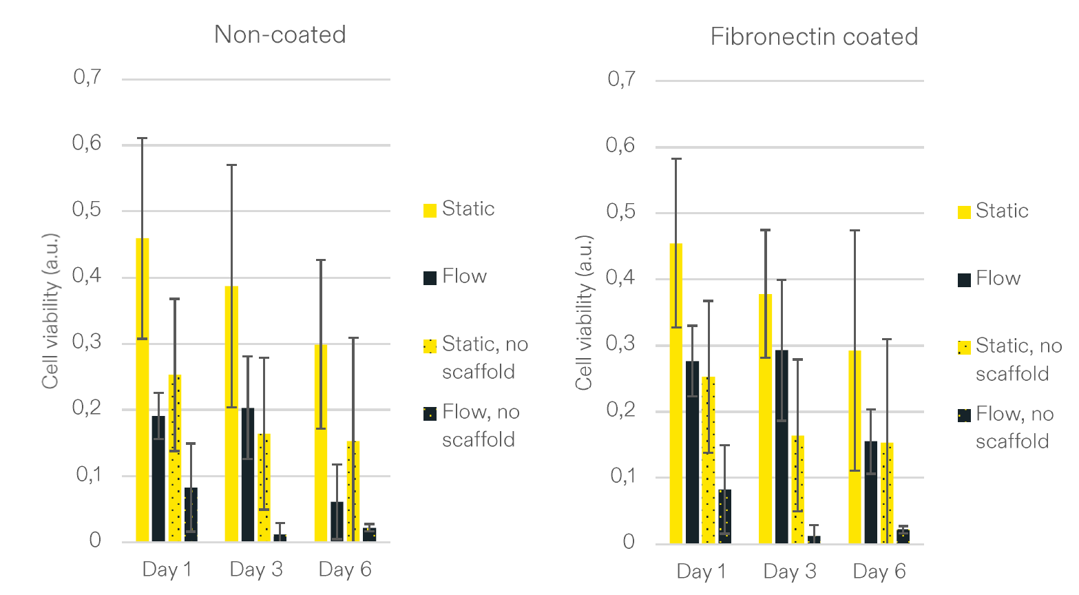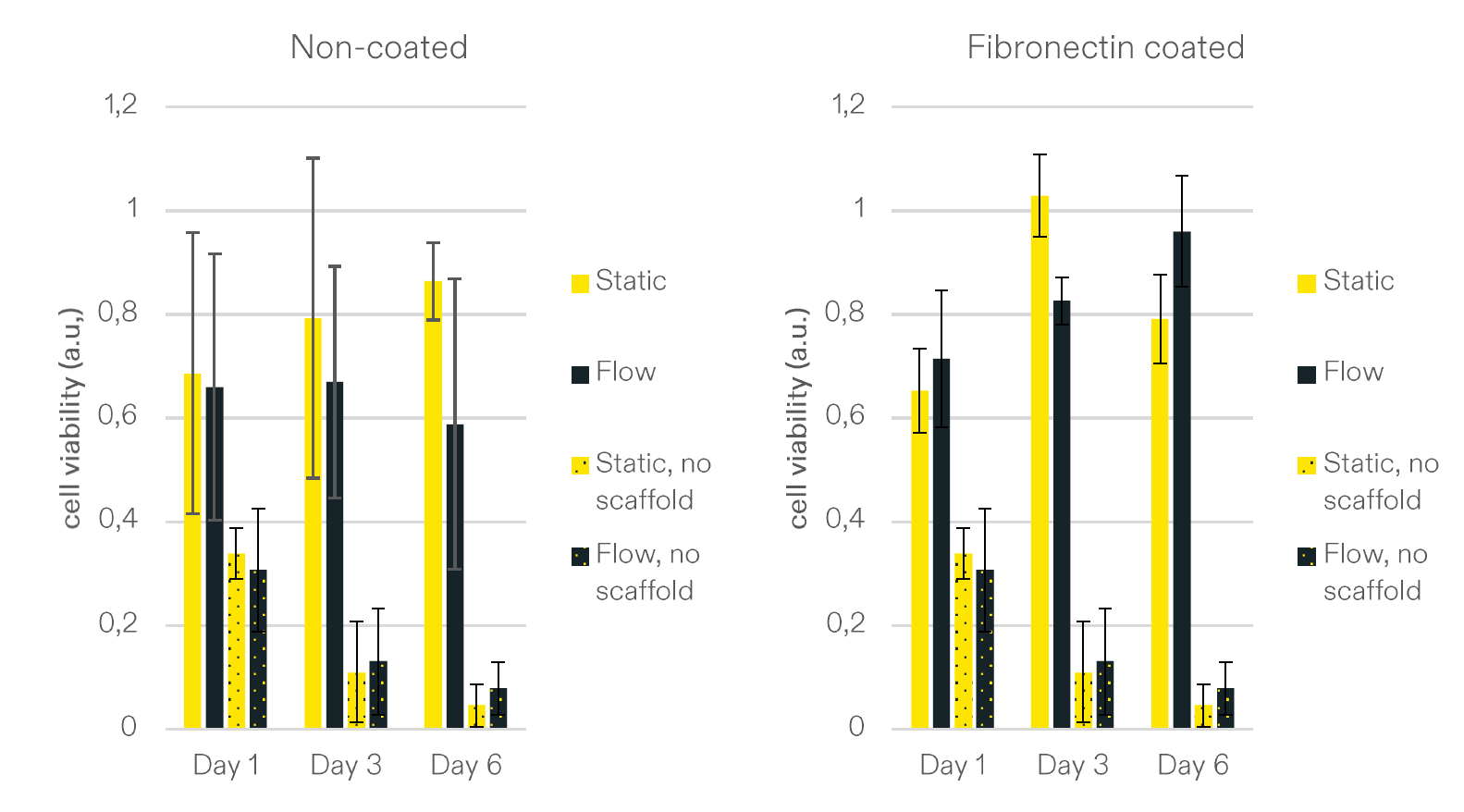 在无涂层的支架中,细胞的活性被维持,而纤维连接蛋白涂层在实验时间范围内提高了细胞增殖。我们观察到,纤维连接蛋白涂层中的细胞生长被液流增强 (图2,右侧) 。
