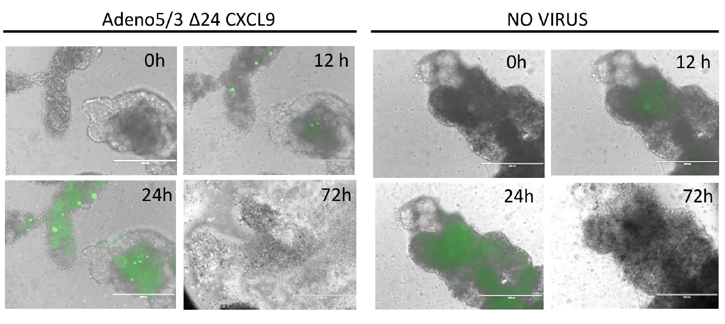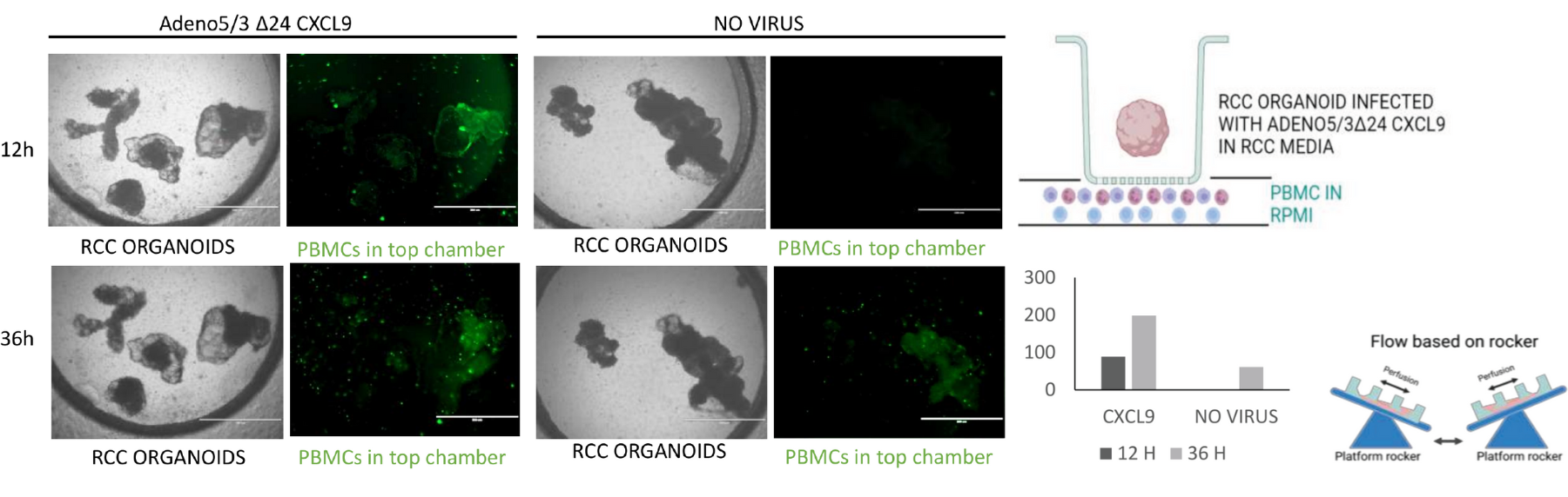 2. 在微流体器官芯片的顶部开放腔室中,肾细胞癌(RCC)PDTOs被感染了编码趋化因子的腺病毒(Adeno/3△24 CXCLg)。在下方的微通道中加入了染有钙黄绿素(Calceingreen)的PBMCs,以便可视化观察免疫细胞向肿瘤的募集过程(图3)。
