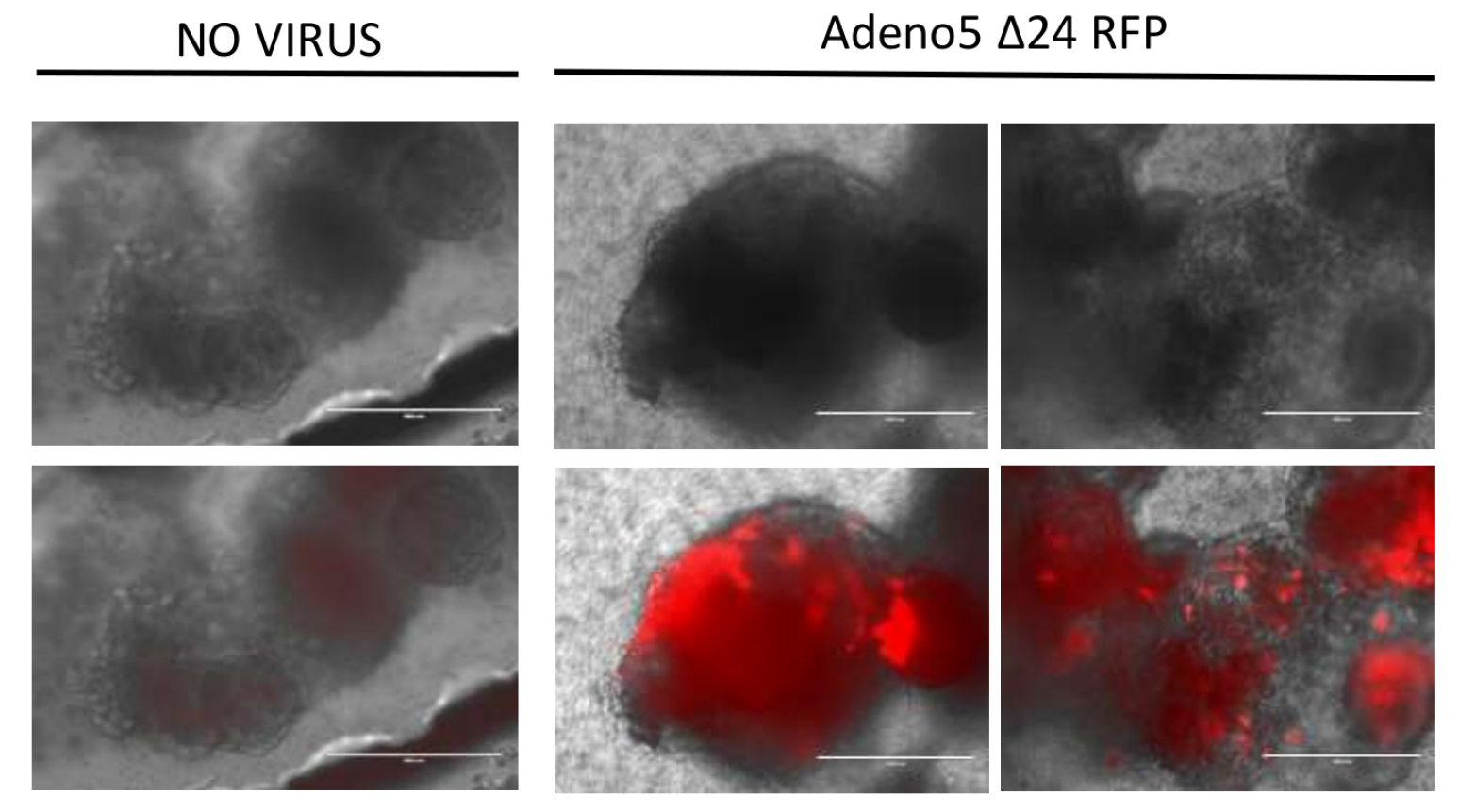 3. 底部的微流体通道还可以用于测试不同的治疗方法。这里作为示例,在底部通道中添加了表达红色荧光蛋白(RFP)的溶瘤腺病毒(AdenosA24 RFP),并在微流体器官芯片的顶部开放腔室中以三维方式培养小鼠胶质母细胞瘤细胞(图4)。