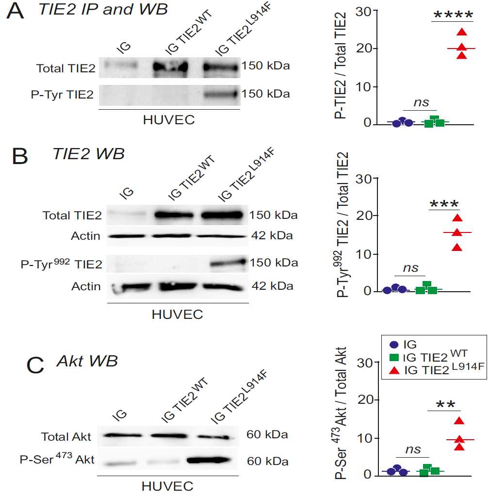 图1. (A) 显示了免疫沉淀中的TIE2表达和磷酸化水平,(B, C) 显示了蛋白质印迹中TIE2和Akt的水平以及抗肌动蛋白。右侧显示了蛋白质印迹信号的定量结果。