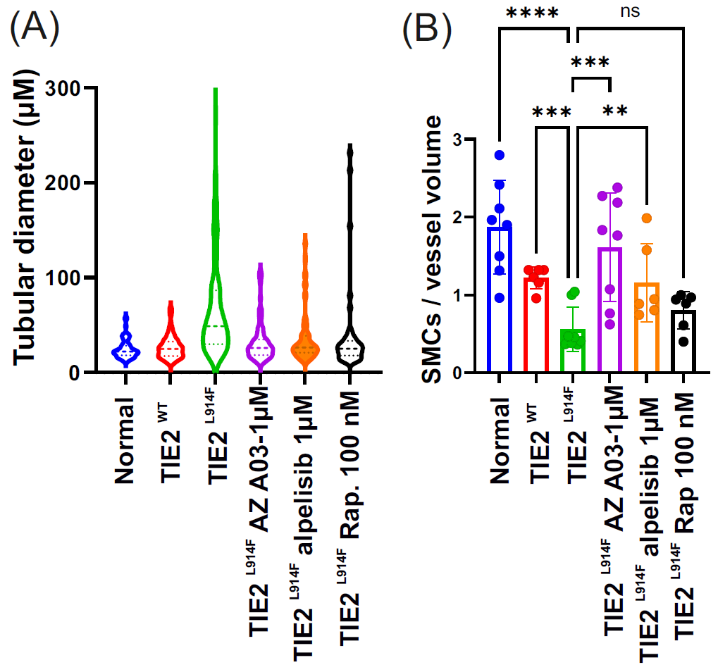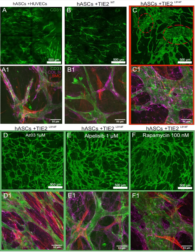 图2:A & A1, B & B1)正常和TIE2WT HUVECs形成了管状网络,如其他人以前所示。C & C1) TIE2L914F结果表现为异常增大的血管结构,Col IV分散,SMCs覆盖较少。D & D1, E & E1, F & F1)显示TIE2^L914F血管结构在处理Az03 1µM、阿培利司1µM和雷帕霉素100nM 48小时后的变化。