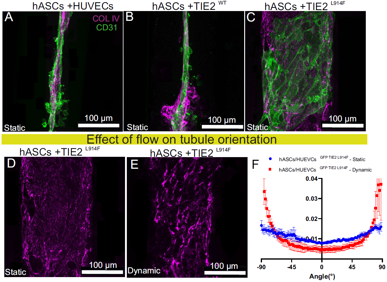 图3. A, B和C)分别显示了hASCs与正常、TIE2WT和TIE2L914F HUVECs共培养的管状形成。D, E)分别显示了静态和动态模式下的COL IV沉积。F)显示了流动对静态和动态模式下管状结构取向的影响。