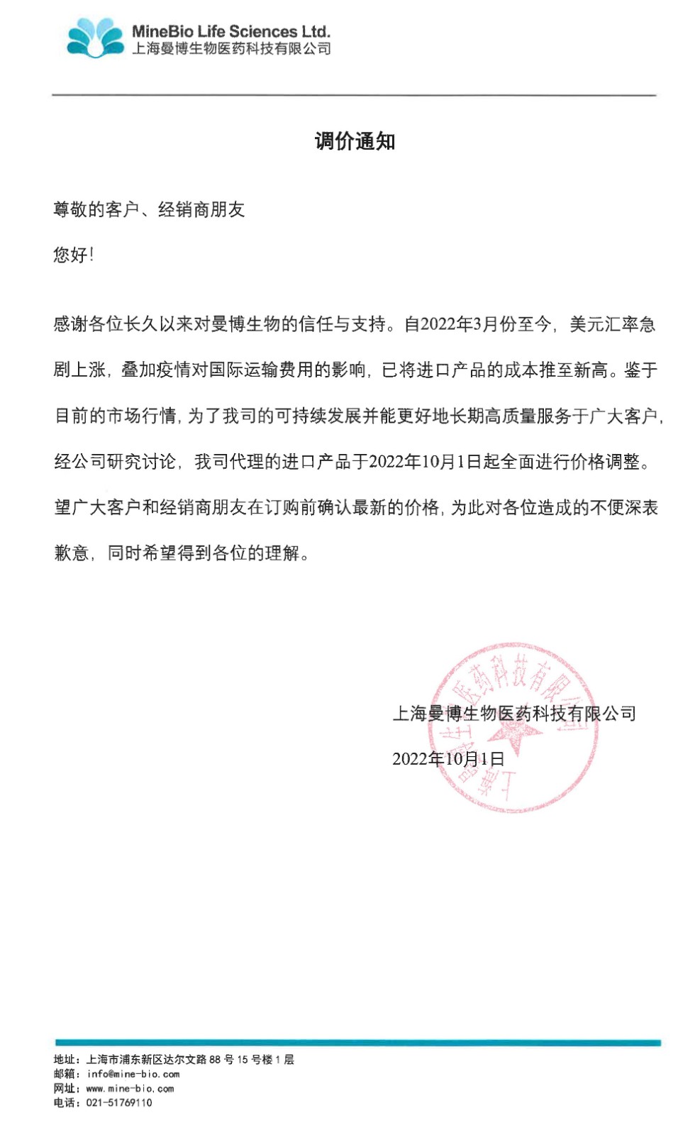 >上海曼博生物 | 调价通知
