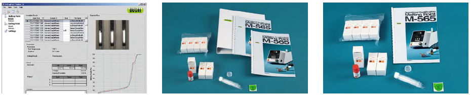 使用方便–专业型套件包括熔点仪 M-565、装样器 M-569、100 熔点毛细管、10支沸点管、10 支沸点毛细管、M-560/565 校准套件、样品托架、通针和清洁工具。