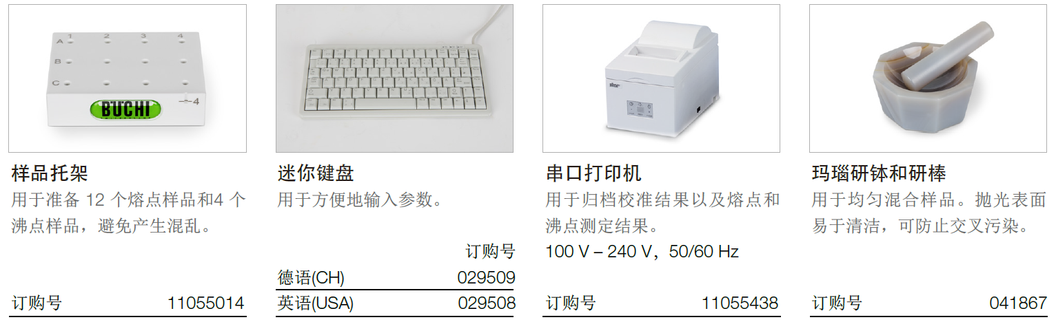 基本型套件包括熔点仪M-560、100支熔点毛细管、10支沸点管、10支沸点毛细管、M-560/565校准套件、样品托架、通针和清洁工具。