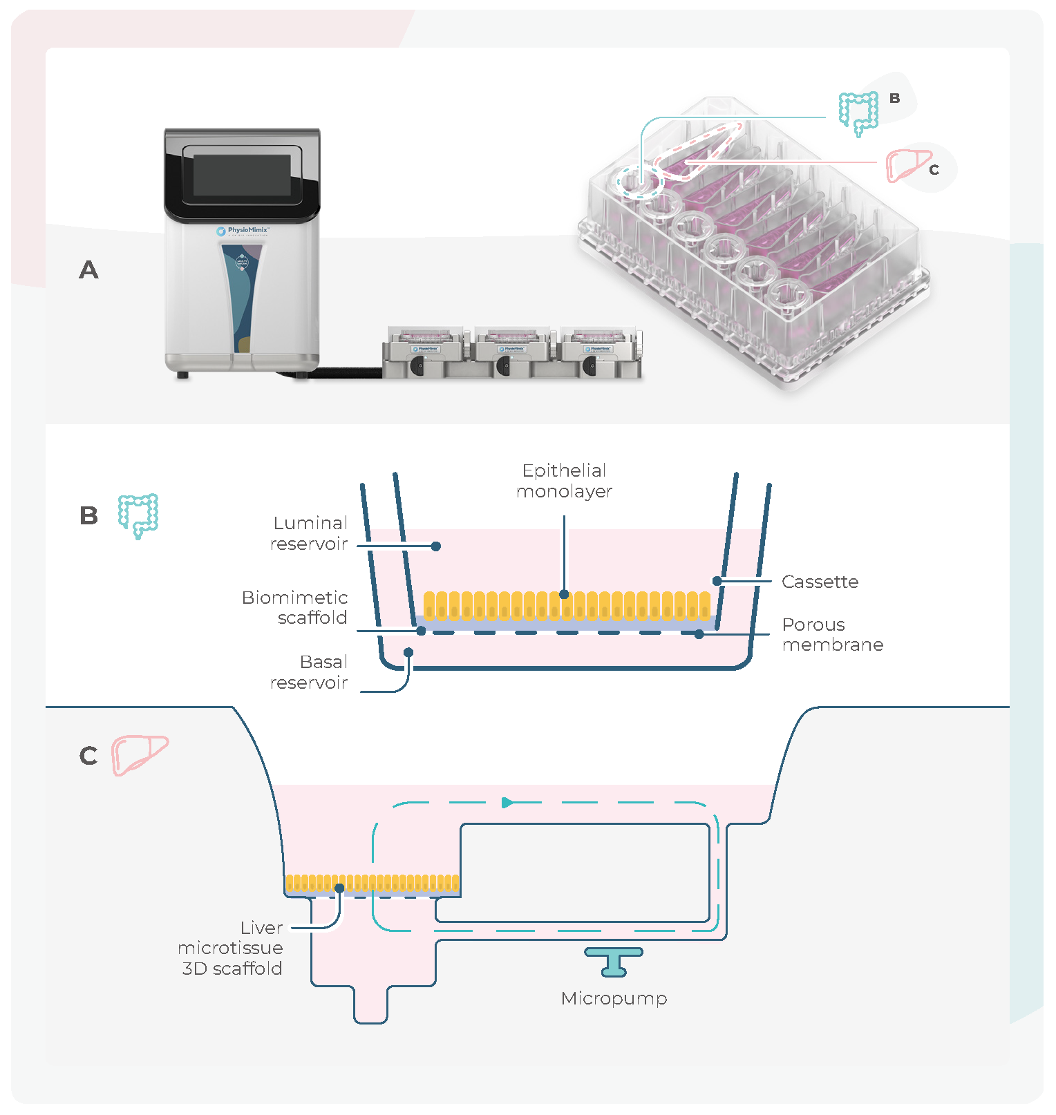 A) PhysioMimix多器官系统及其多芯片双器官板的设置,展示了板内肠道和肝脏隔室的位置。每个板最多可以培养6个肠/肝模型。