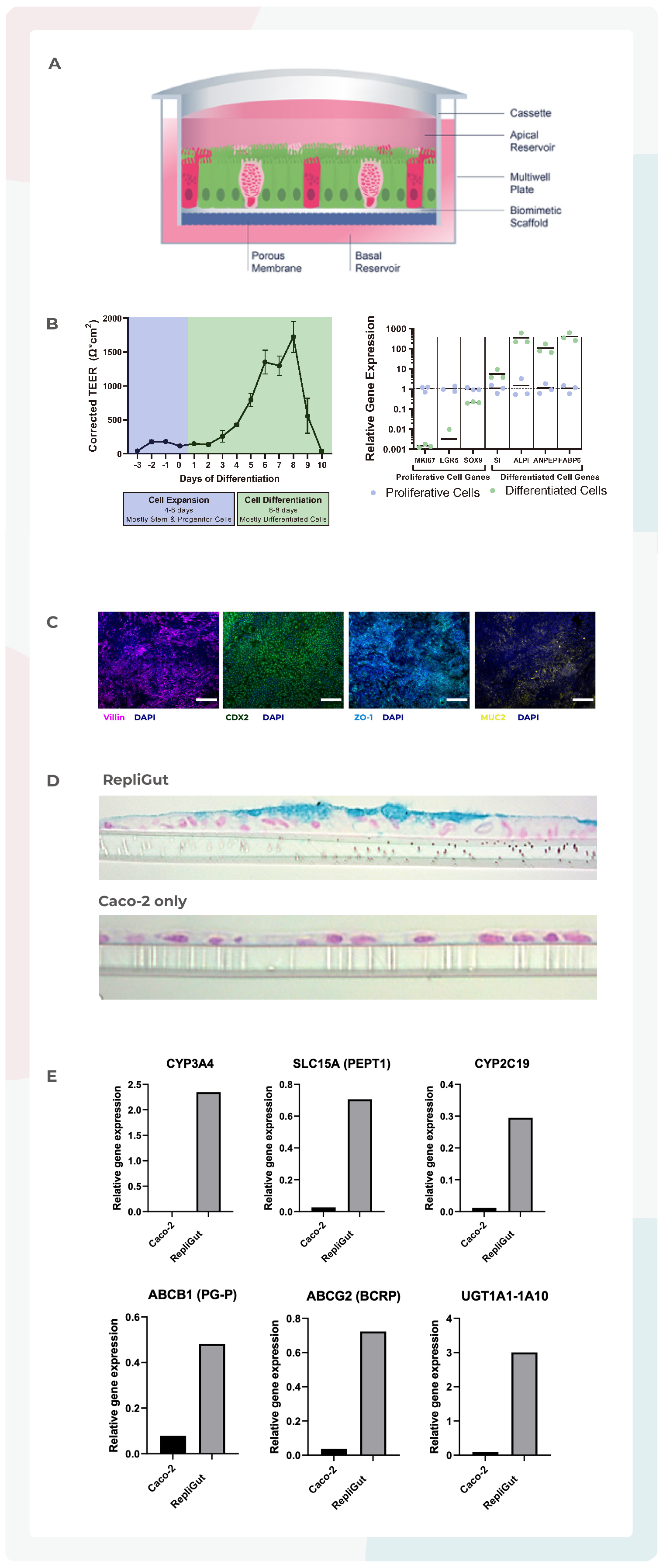 C) RepliGut模型的免疫荧光图像。屏障染色包括DAPI(深蓝色)、紧密连接蛋白ZO-1(浅蓝色)以及其他肠道标志物如MUC2(黄色)、微绒毛蛋白(紫色)和CDX2(绿色)。图像比例尺为CDX2的100微米和其他三个标志物的200微米。