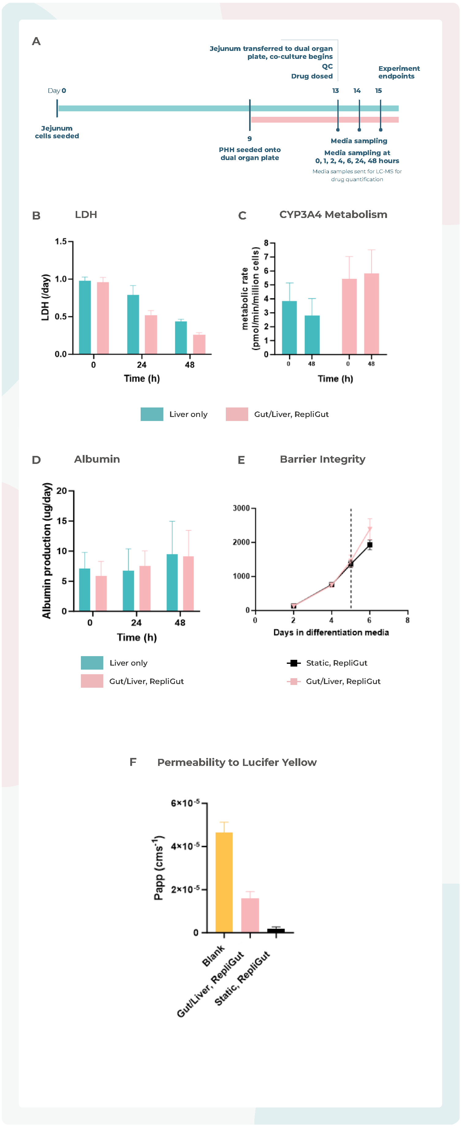 A) 建立原代RepliGut/肝MPS的实验时间线。RepliGut首先在静态下独立培养13天,然后在PHH播种后4天被转移到PhysioMimix双器官板的Transwell隔室中。共培养在化学定义的培养基中维持48小时。在共培养的0、24和48小时测量肝细胞健康和功能性标志物,同时培养一个仅肝脏的MPS作为对照。我们研究了B) LDH释放、C) CYP3A4活性和D) 白蛋白生成。通过E) TEER和F) Lucifer黄色的通透性评估肠/肝MPS中RepliGut的屏障完整性,并与在标准RepliGut成熟培养基中全程静态培养的独立RepliGut进行比较。