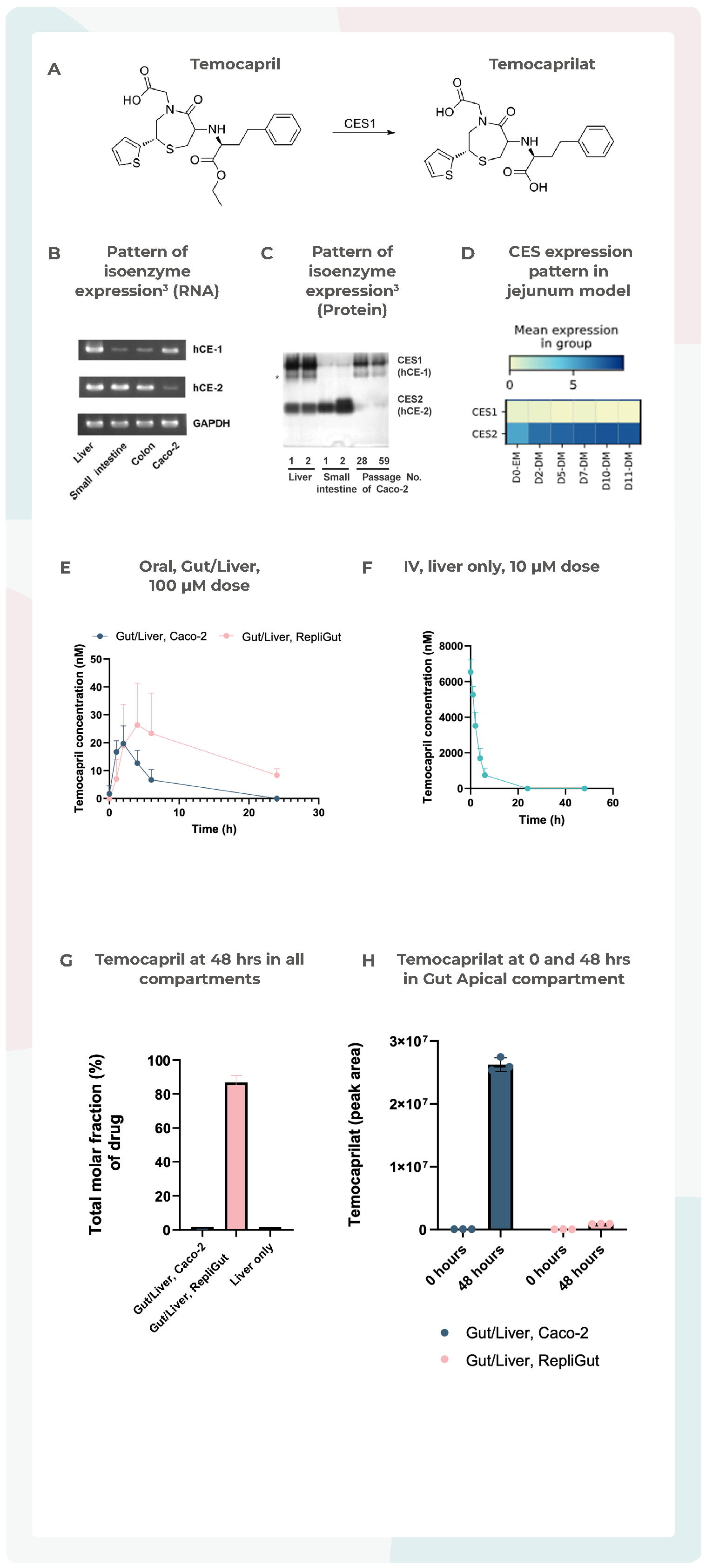 一:替莫卡普利(Temocapril),是一种设计为抗肠道水解的前药,通过羧酸酯酶1(CES1)代谢为替莫卡普利酸(Temopcarilat)(图5A)。人类中的同工酶模式已被很好地表征,肝脏和肠道分别表达CES1和CES2[3]。在Caco-2细胞中,由于主要表达CES1,导致药物清除率被高估(图5B-C)。相反,RepliGut模型更符合人类的CES1和CES2表达比例,使其在前药研究中更具相关性(图5G)。替莫卡普利的清除率通过口服和静脉给药进行分析(图5E)。静脉给药后24小时内肝脏迅速清除(图5F)。与肠道CES表达一致,原代RepliGut/肝MPS正确报告了替莫卡普利对肠道水解的抵抗性,并且在口服给药后48小时肠道顶端隔室中生成的替莫卡普利酸较少。