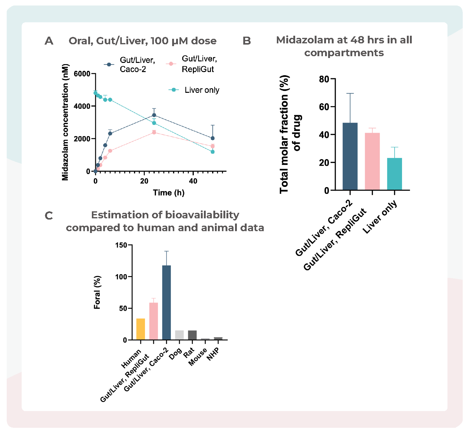 6 二:我们评估了两种肠/肝MPS模型中咪达唑仑(Midazolam)的生物利用度,这是一种主要通过CYP3A4酶进行肠道清除的药物[4]。咪达唑仑在静脉给药后迅速被肝脏清除,反映出其高内在肝脏清除率(19 mL/min/Kg)(图6A)。与Caco-2肠/肝MPS相比,原代RepliGut/肝MPS对咪达唑仑的清除率更高(图6B)。原代RepliGut/肝MPS还提供了一个更接近人类临床观察的口服生物利用度估计(图6C)。