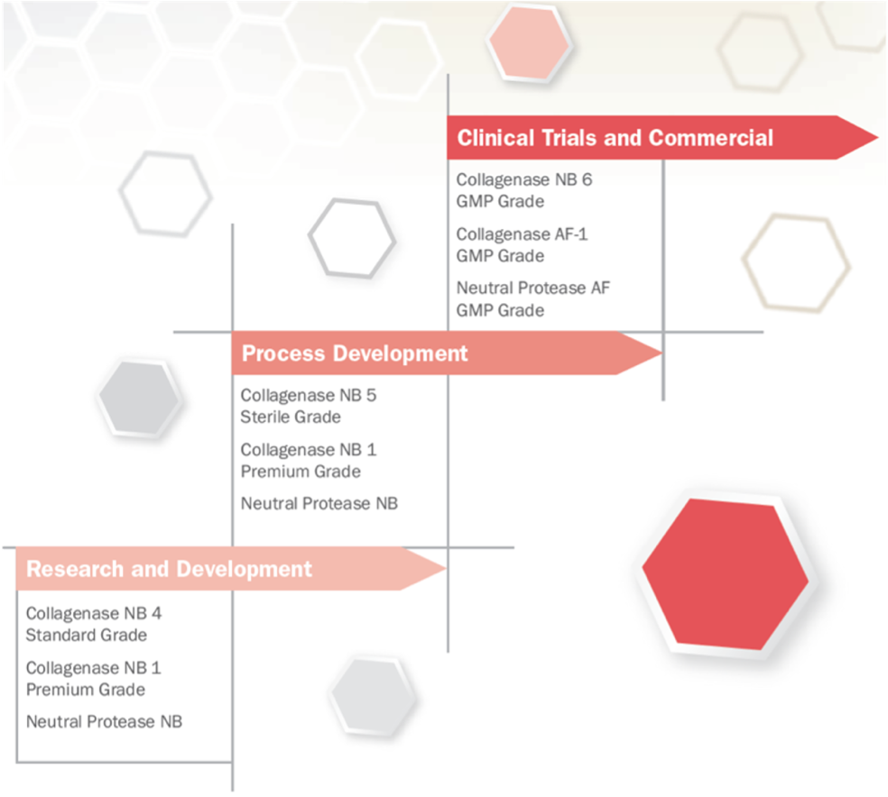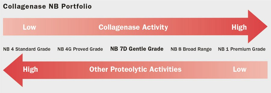 Nordmark的产品组合包括几种胶原酶NB和中性蛋白酶NB产品,可根据其纯化水平(未纯化、纯化、高纯化)和应用领域(研究、临床)进行区分。