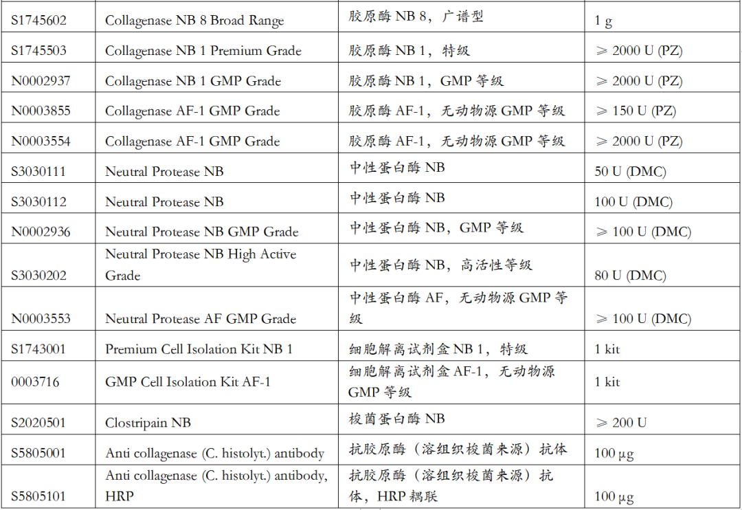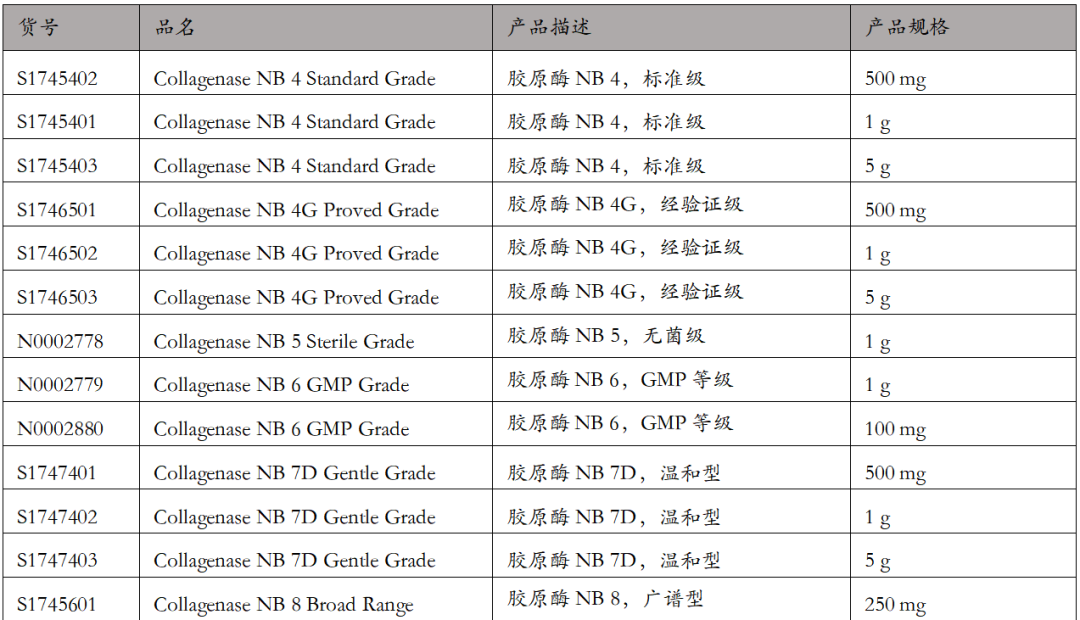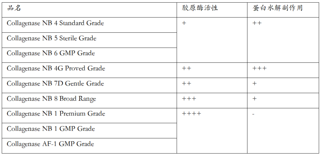 a) 不同规格,纯度,活性的胶原酶以及中性水解酶