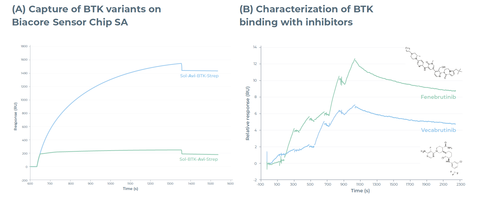 图6:(A)N端和C端带Avi标签的BTK392-659变体在Sensor Chip SA上的Biacore SPR 传感器图。(B)Fenebrutinib和vecabrutinib与N端生物素化BTK(SOL-Avi-BTK392-659)结合的Biacore 单循环动力学传感器图。