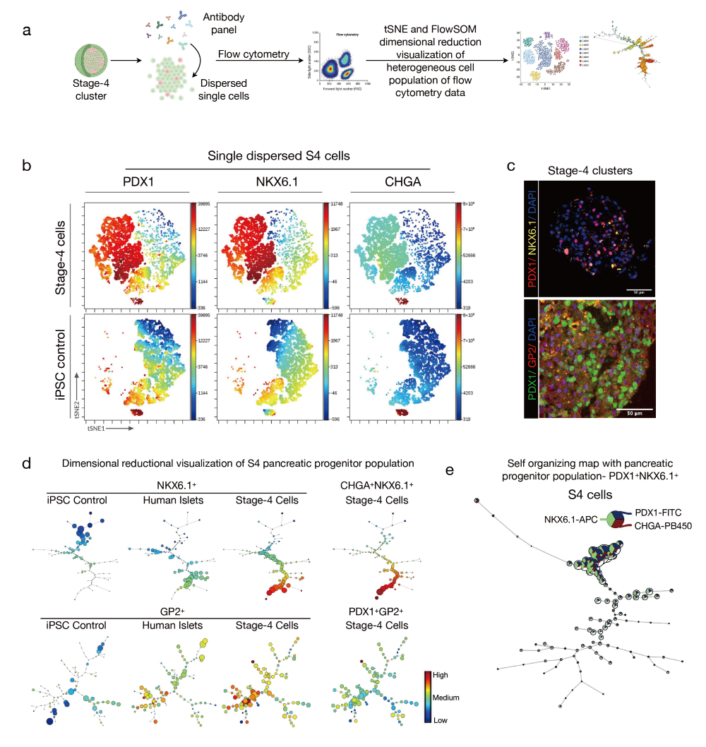 b.第4阶段50,000个祖细胞的单细胞viSNE图,显示PDX1、NKX6.1和CHGA标记物,与未分化的iPSC对照细胞对比。颜色梯度表示viSNE岛屿中细胞密度,从高(红色)到低(蓝色)。