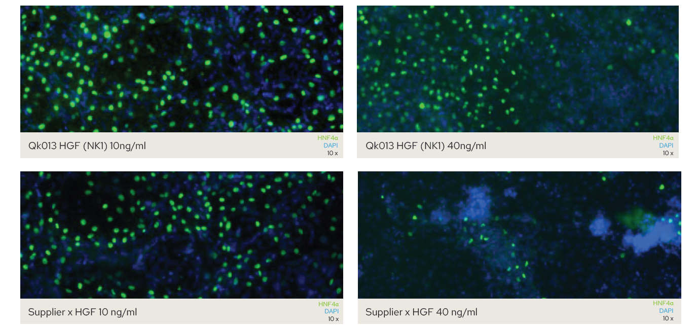 HGF(NK1) 仅以10ng/ml的剂量,促进人类诱导多能干细胞有效地分化为类肝细胞,并且肝细胞标志物HNF4α的表达高度均一。