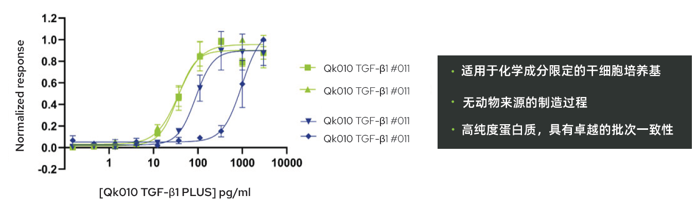 TGF-β1 PLUS(Qk010)是一种高纯度、无动物成分的蛋白质,具有生化和定量生物活性数据,以确保干细胞的可重复和可扩展的维护。