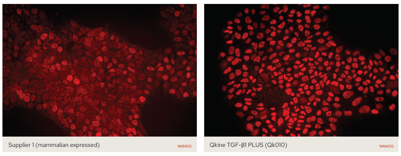 Nanog.Qkin eTGF-β1 PLUS (无动物成分) 与另一供应商提供的哺乳动物表达的TGF-β1之间的比较显示,TGF-β1 PLUS 在1 ng/ml浓度下有效地维护iPSCs,并且高度均匀地表达了多能性标记物Nanog。