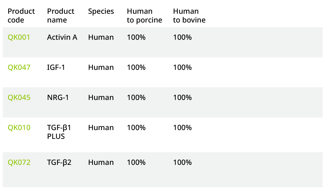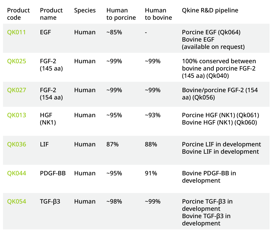 该分析包括序列保守性(见Table 1)和功能域分析(数据未显示)。这些数据以及行业优先事项已被用于在Qkine优先开发与物种匹配的生长因子。以下生长因子被应用于培育肉类和脂肪的培养基配方中,并且在不同物种之间的保守性较差。