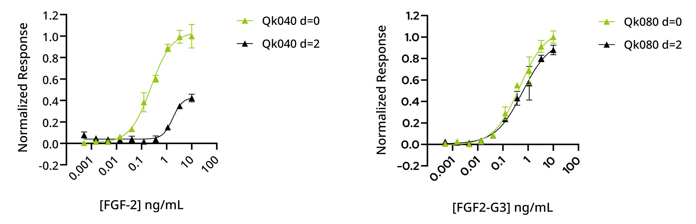 Figure 2: 野生型牛/猪FGF-2(黑色)和牛/猪FGF2-G3(绿色)具有等效的生物活性。Qk080牛/猪FGF2-G3(EC50 0.190 ng/ml)和Qk040野生型FGF-2(EC50 0.237 ng/ml)。