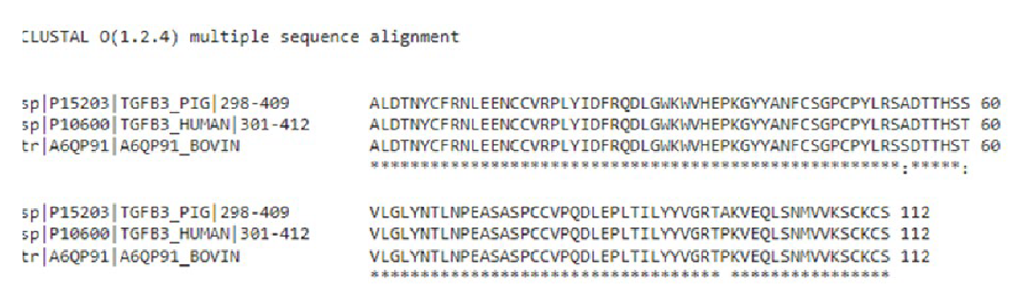 Figure 4: 猪、牛和人类TGF-β3的多序列比对显示人类和猪TGF-β3之间的序列保守性约为98%,人类和牛TGF-β3之间的序列保守性约为99.%。