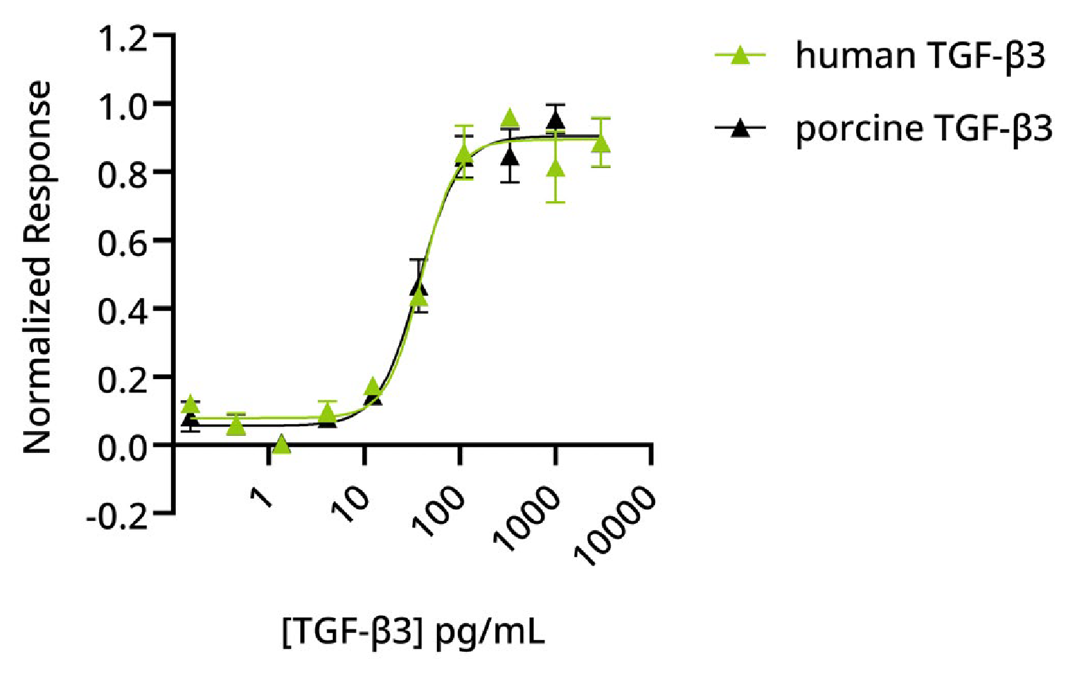 Figure 5:使用TGF-β3响应的萤火虫荧光素酶报告基因在HEK293T细胞中测定了人类和猪TGF-β3的活性。人类TGF-β3的EC50=39.53 pg/ml,猪TGF-β3的EC50=37.51 pg/ml。细胞用TGF-β3的系列稀释液处理6小时,进行了三次重复实验。测量萤火虫荧光素酶活性,并归一化至对照Renilla荧光素酶活性。