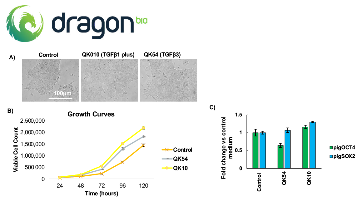 使用来自龙生物技术公司( Dragon Biotechnologies)的piPSC细胞系验证了Qkine人类/猪/牛TGFβ1和人类TGFβ3在培养中的有效性。当猪诱导多能干细胞(piPSCs)暴露于人类/牛/猪TGFβ1或人类TGFβ3时,表现出典型的菌落形态,并且与在标准条件下使用标准培养基培养的piPSCs相比,生长速度较大提高(Figure 6A-B)。在补充TGFβ1后,多能性标志物OCT4和SOX2的表达水平保持稳定,如Figure 6C所示。