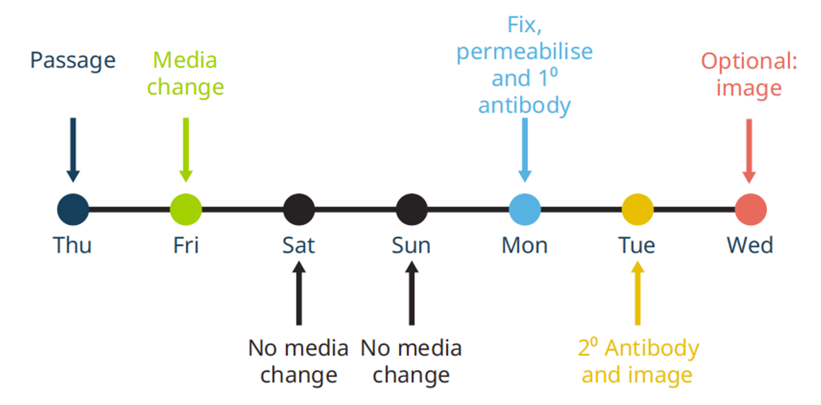 iPSC常规培养工作流程示意图(图1)概述了每日维持iPSC的步骤,并展示了与使用标准协议的区别。多能性评估时间表突出显示了测试iPSC多能性保持情况的重要时间点(图2)。