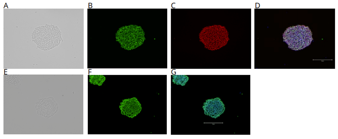 3天后,用4%多聚甲醛固定细胞,并使用稀释在0.1% Triton X-100中的10%驴血清(donkey serum)进行封闭和透化。然后使用特异性抗体针对多能性标志物(OCT-4、NANOG和SOX2)在4°C下过夜免疫染色。随后,洗涤iPSC,并与二抗驴抗小鼠AlexaFluor 647或驴抗山羊(Donkey anti-Goat)AlexaFluor488和Hoechst 33258一起孵育,然后在磷酸盐缓冲盐水(PBS)中成像。使用EVOS M5000系统获取明场和荧光图像。