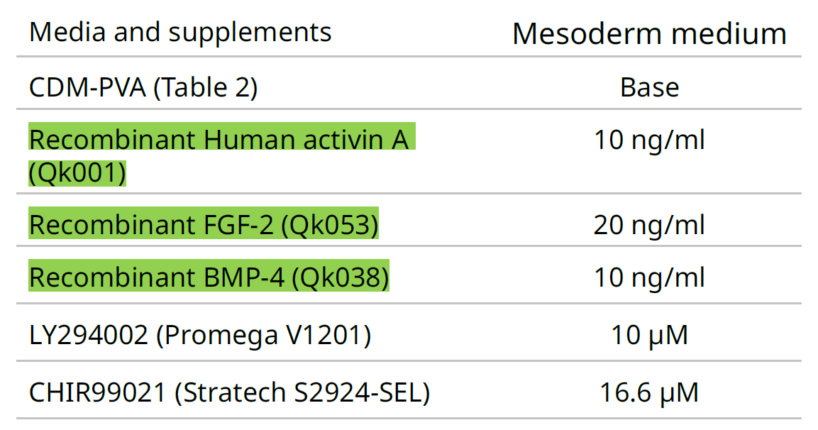 本应用说明中提供的数据表明,使用 Qkine FGF2-G3(Qk053)、Qkine activin A(Qk001) 和 BMP-4 (Qk038) 支持 iPSC 分化为中胚层细胞。