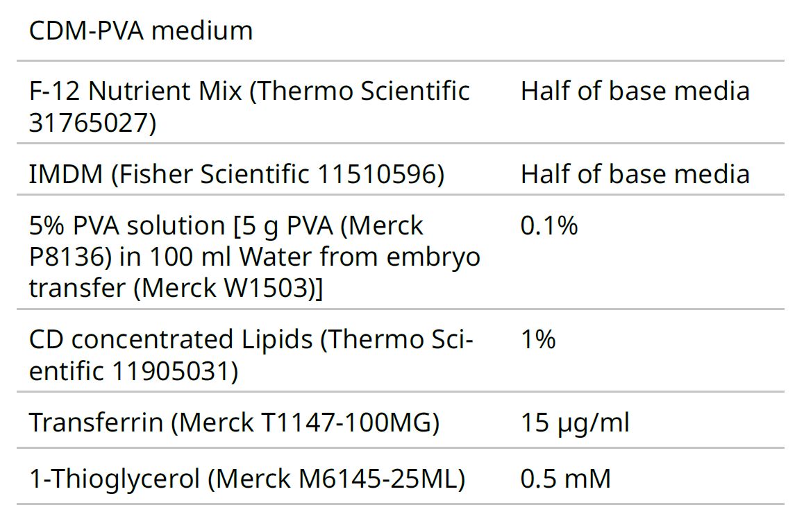 表2.CDM-PVA培养基配制成分,各成分无菌添加,并在使用前过滤培养基