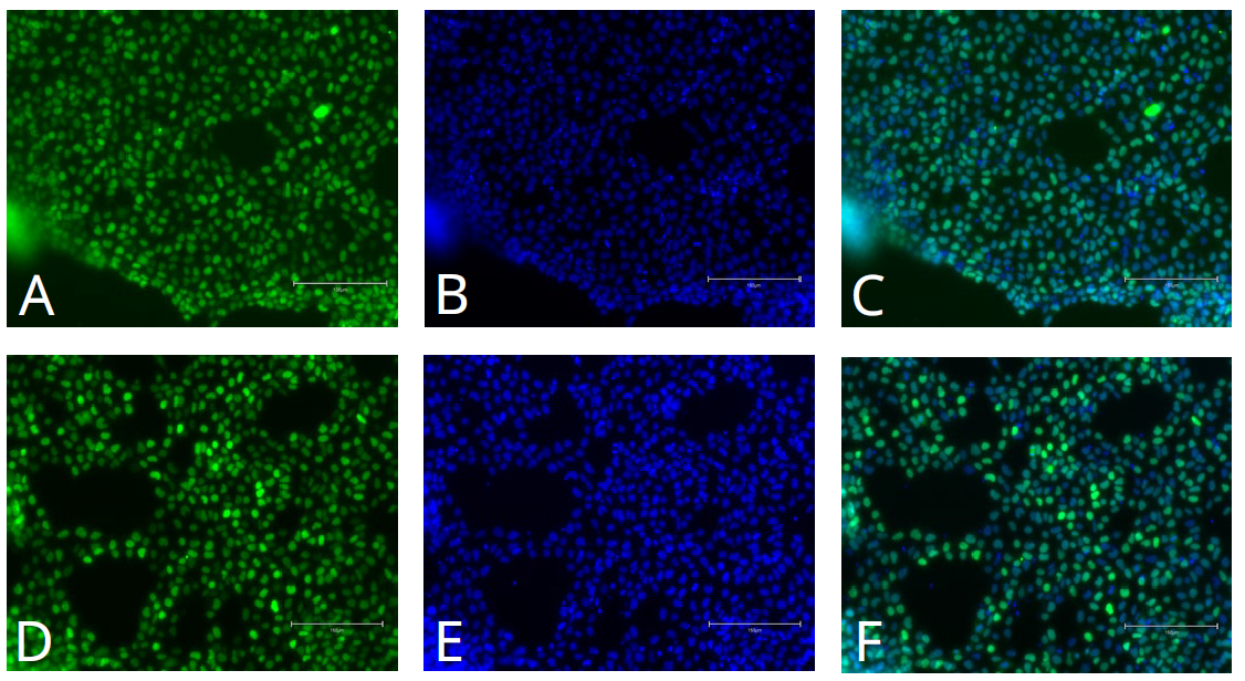 图2. 分化 iPSC 中中胚层标志物的免疫细胞化学。转录因子 Brachyury [绿色,A]、Hoechst 33258 [蓝色,B]、Brachyury 和 Hoechst 的组合 [C] 和转录因子 MIXL1 [绿色,D]、Hoechst33258 [蓝色,E]、MIXL1 和 Hoechst 的组合 [F]。图像是使用 EVOS M5000 获取的(比例尺 = 150 µm)。