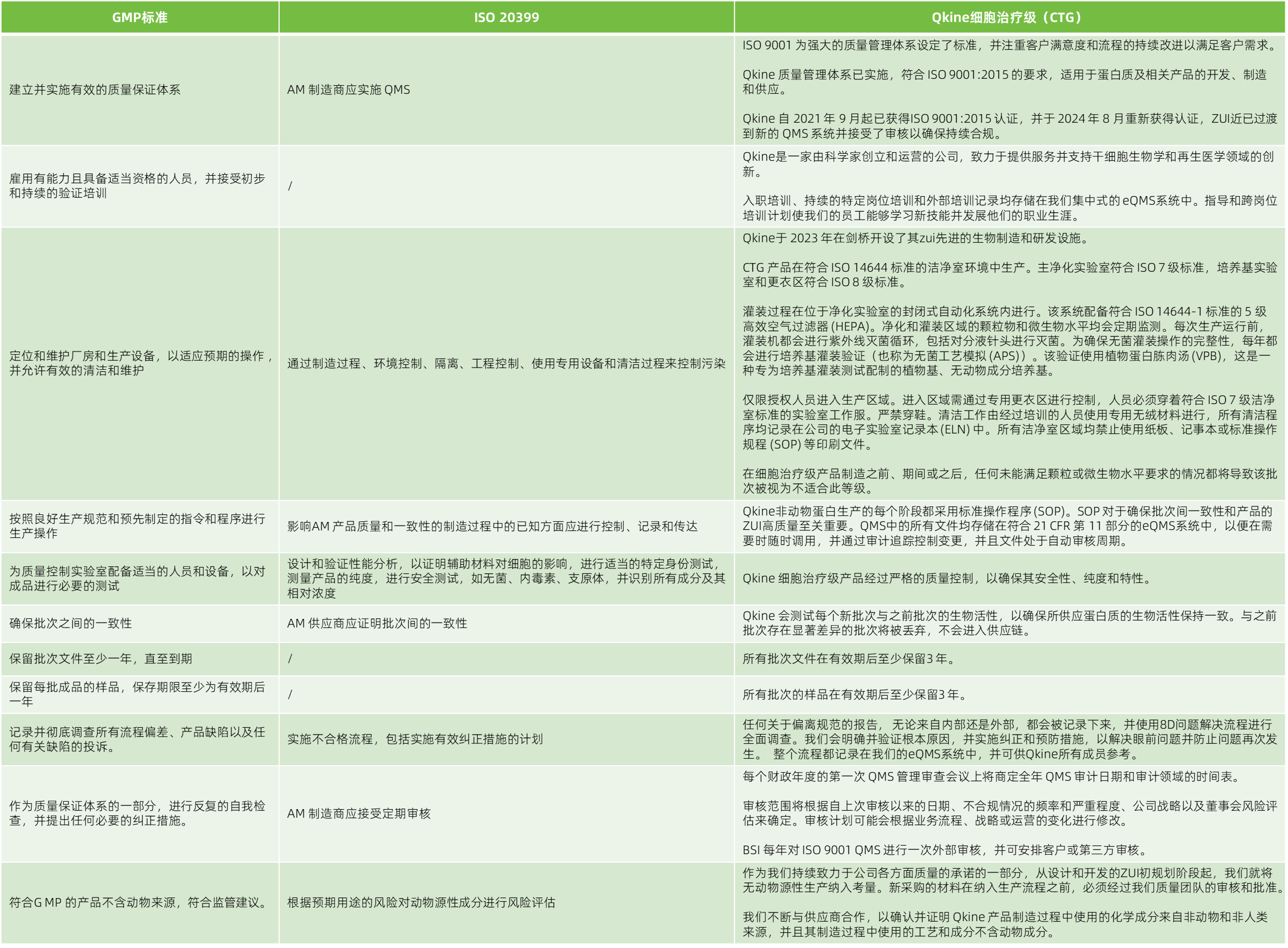 Qkine 细胞治疗级蛋白质符合 GMP 标准和 ISO 20399,请继续阅读下面的对比表,以了解这些标准的要求以及Qkine如何使其制造流程与这些标准保持一致。