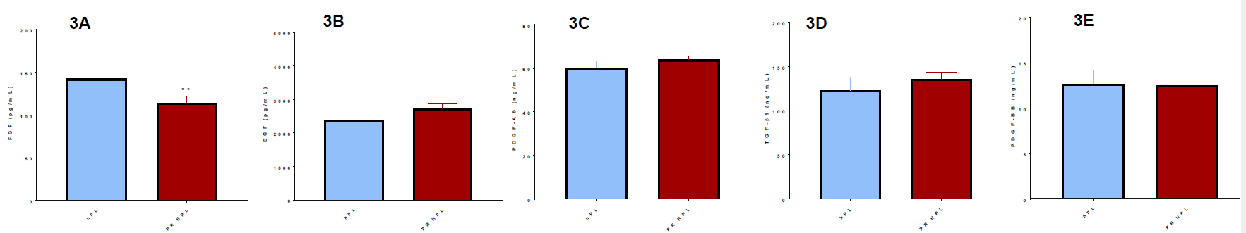使用ELISA 等方法对于伽玛辐射的普通hPL((蓝色))和电子束的nLiven(红色)针对以下的常见hPL中的细胞因子分别进行3组重复分析求取平均值,该实验中发现除了3A图中的成纤维细胞生长因子(FGF)水平,其他细胞因子如3B图中的内皮生长因子(EGF)、3C图中的血小板衍生生长因子AB (PDGF-AB)、3D图中的组织生长因子β (TGF-β)以及3E中的血小板衍生生长因子BB (PDGF-BB)在通过电子束照射(E-beam)的PR工艺获得的hPL中含量是相对偏高的。