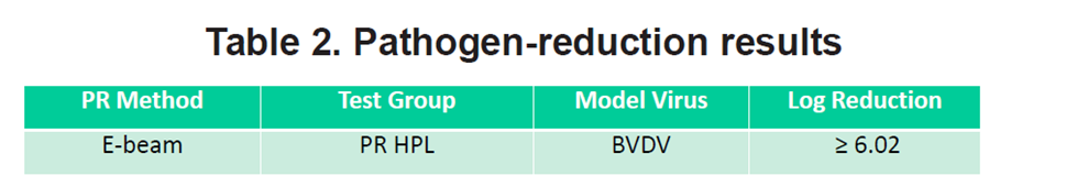 使用牛病毒性腹泻病毒(BVDV)进行标准病毒空斑试验评估生产工艺去除和/或灭活病毒的能力,在小规模的生产工艺中进行相关病原体减少/去除效果的验证。主要在应用电子束处理病原体步骤之前,将BVDV刺突病毒引入样品,然后对经电子束处理的样本进行残留病毒分析。如上图表2中所示PR 工艺的hPL的显示模型包膜病毒BVDV减少了6个对数值。