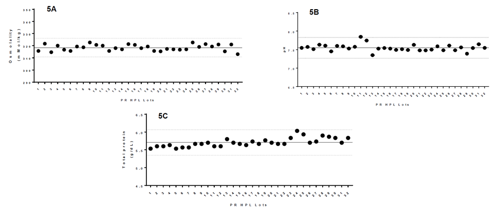 图5 PR工艺的hPL关于渗透压(Osmolality)、pH以及总蛋白的批间一致性数据展示