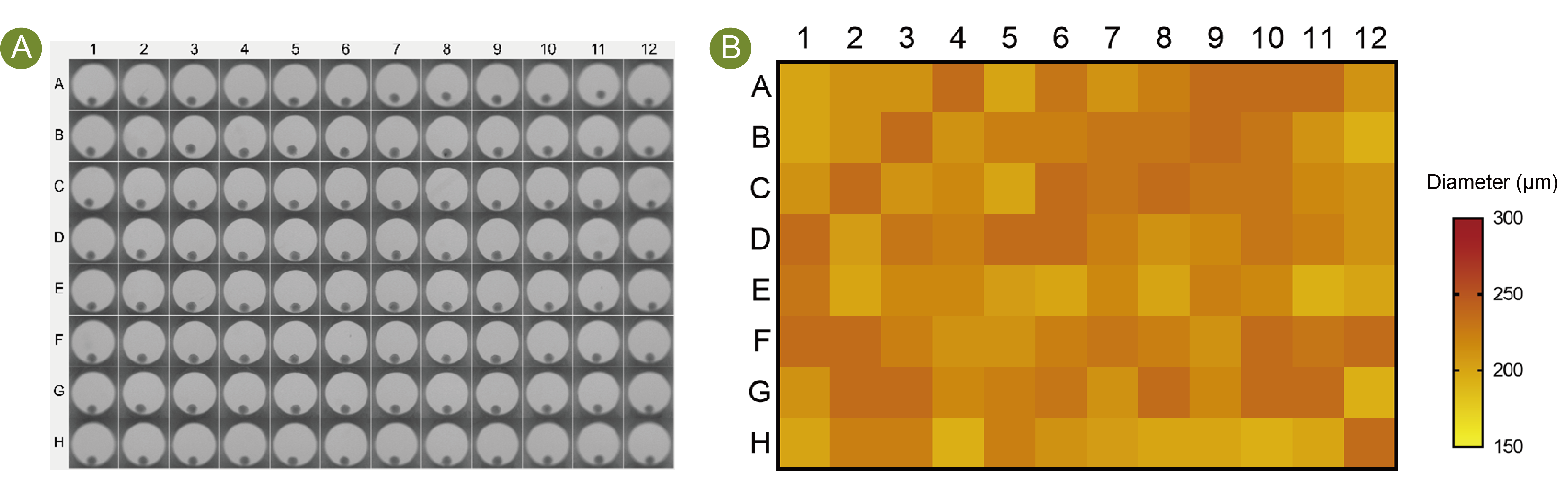图6:HCT-116细胞培养3天后肿瘤微球的直径均一性,A为明场图片,B为直径分布热图