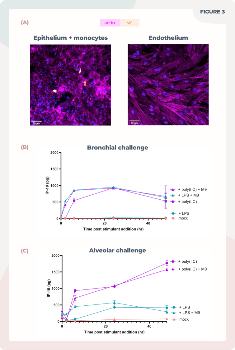 将原代人类肺微血管内皮细胞加入Transwell的底侧,与上皮细胞共培养。在肺泡和支气管培养中,添加THP-1单核细胞到底侧以模拟循环单核细胞。在肺泡培养中,还将THP-1细胞添加到顶侧以模拟肺泡巨噬细胞(见图1)。为了测试共培养炎症反应,细胞接受脂多糖或聚(I:C)的刺激。在48小时内收集来自底侧的培养基样本,并通过ELISA分析IP-10/CXCL10的分泌情况。