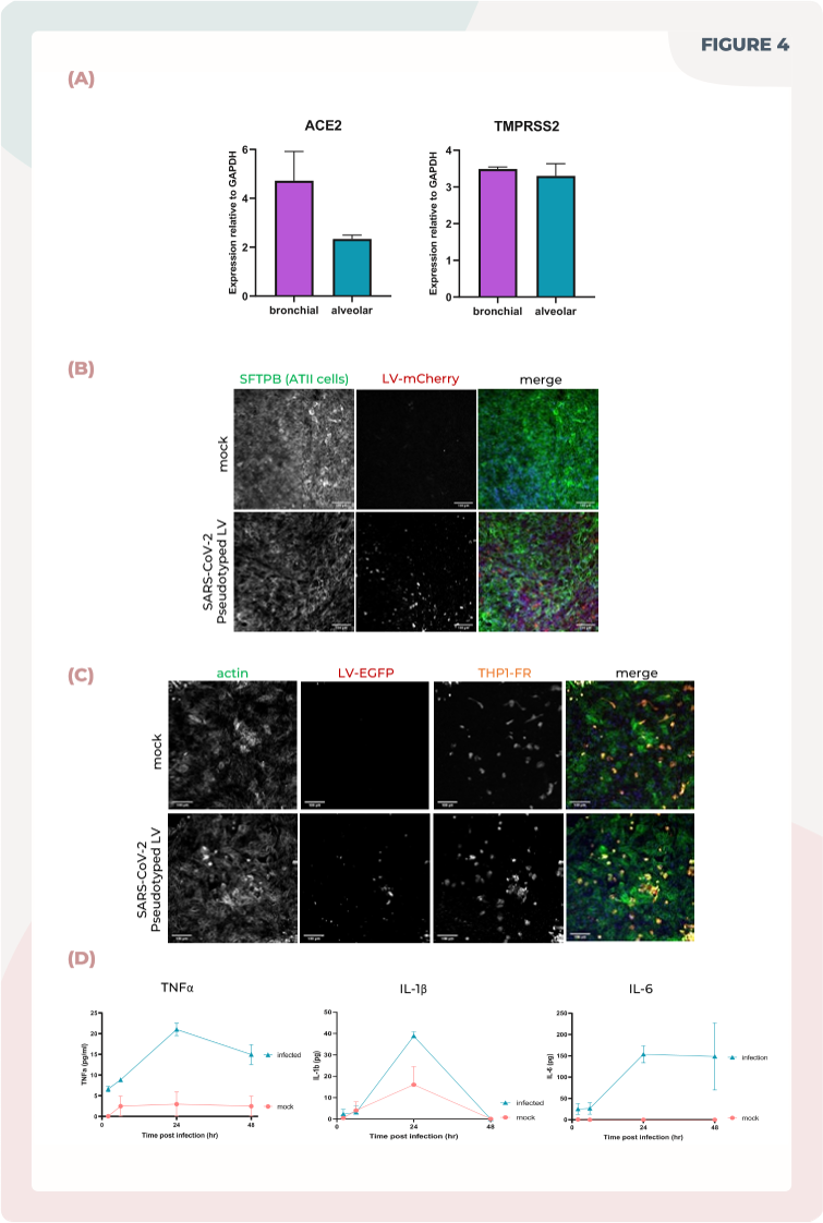 应用携带mCherry标签的表达SARS-CoV-2 Spike(D614G)蛋白的假型化慢病毒来模拟COVID-19研究,将其施加到模型的顶侧,持续48小时。在48小时感染过程中,收集来自模型底侧的培养基样本,然后固定组织,并使用抗SFTPB抗体、鬼笔草酮和DAPI染色。通过共聚焦显微镜分析组织,以确定感染效率。将单核细胞标记为CellTracker Far Red染料,并加入培养中,以确定感染过程中的免疫细胞相互作用。通过ELISA分析培养基样本中的IL-1β和IL-6的分泌情况。