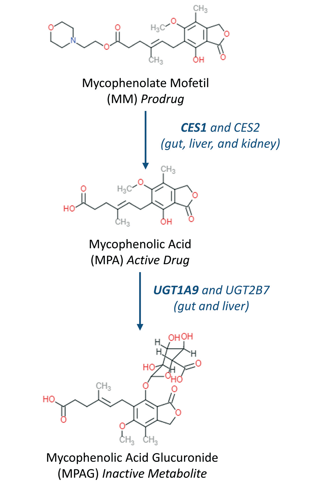 Fig.1 霉酚酸酯活化和进一步代谢的主要代谢步骤和参与代谢转化的主要器官和酶。