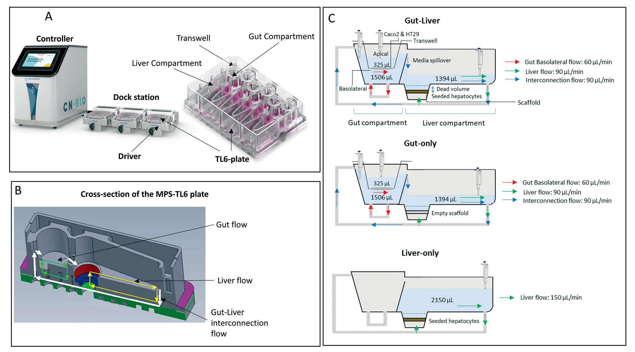 该板与CN Bio的PhysioMimix多器官实验室台式仪器兼容,由六个孔组成,每个孔有两个腔室,一个Transwell屏障模型,一个肝脏模型(图 2-A)。液体流速可以在每个腔室,以及从肝脏腔室到transwell屏障腔室中互连通道中,独立控制。肠道屏障模型是由肠上皮细胞和杯状细胞混合培养在一个通透的Transwell 薄膜上(图 2-B)。三种实验系统的腔室、培养基体积和流速以及采样点如图所示(图 2-C)。