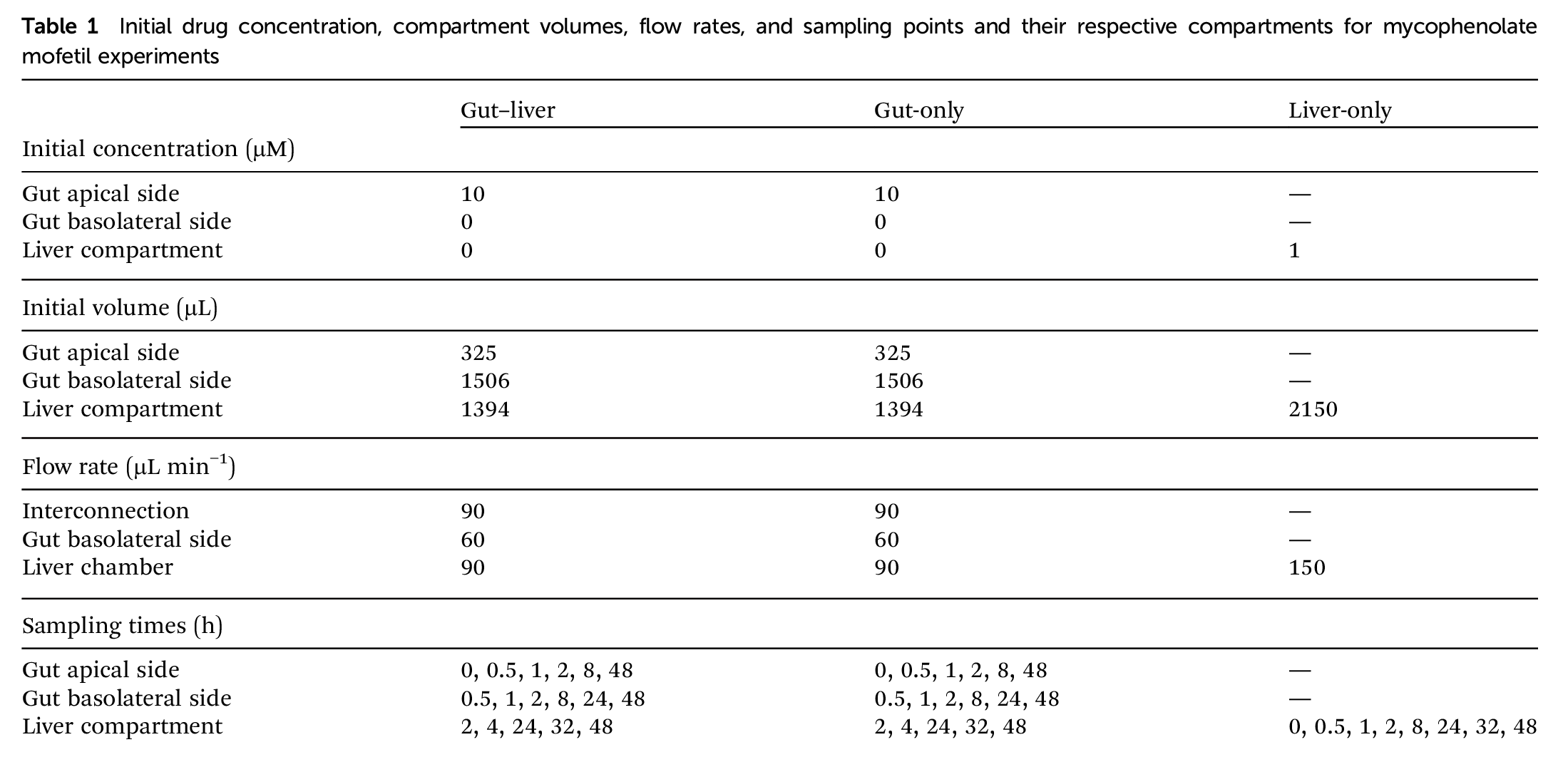表1和图3是在三种实验系统中评估霉酚酸酯的肠道-肝脏 OoC 实验的初始药物浓度、各部分体积、流速,以及采样点时间轴和主要事件。
