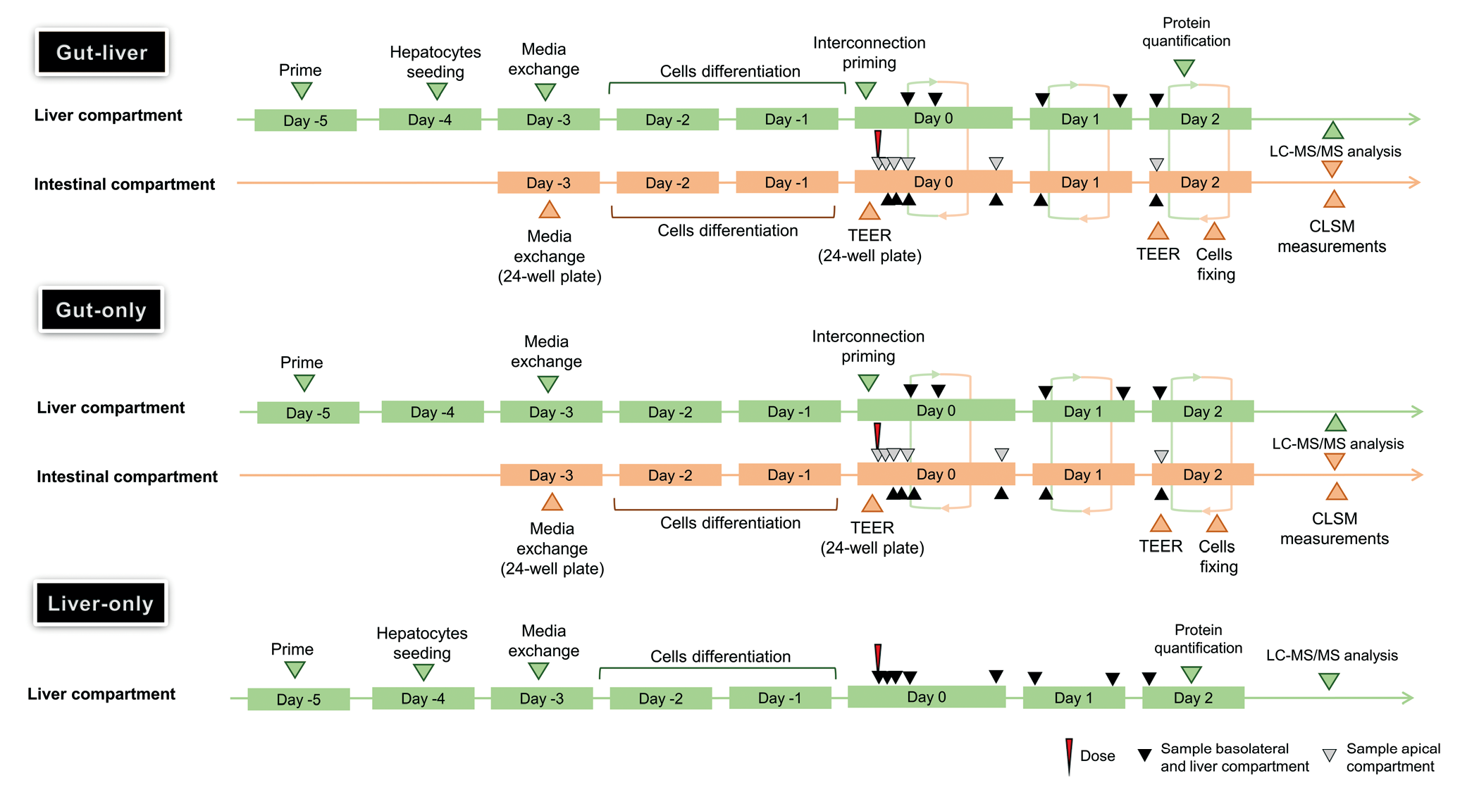 Fig.3 在三种实验系统中评估霉酚酸酯的肠道-肝脏 OoC 实验的时间轴和主要事件。