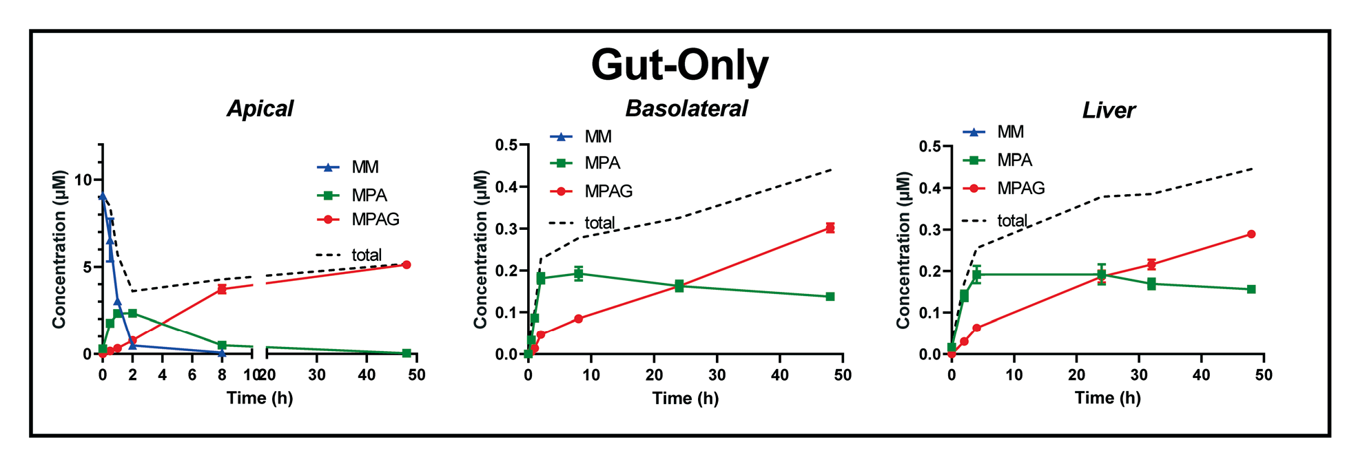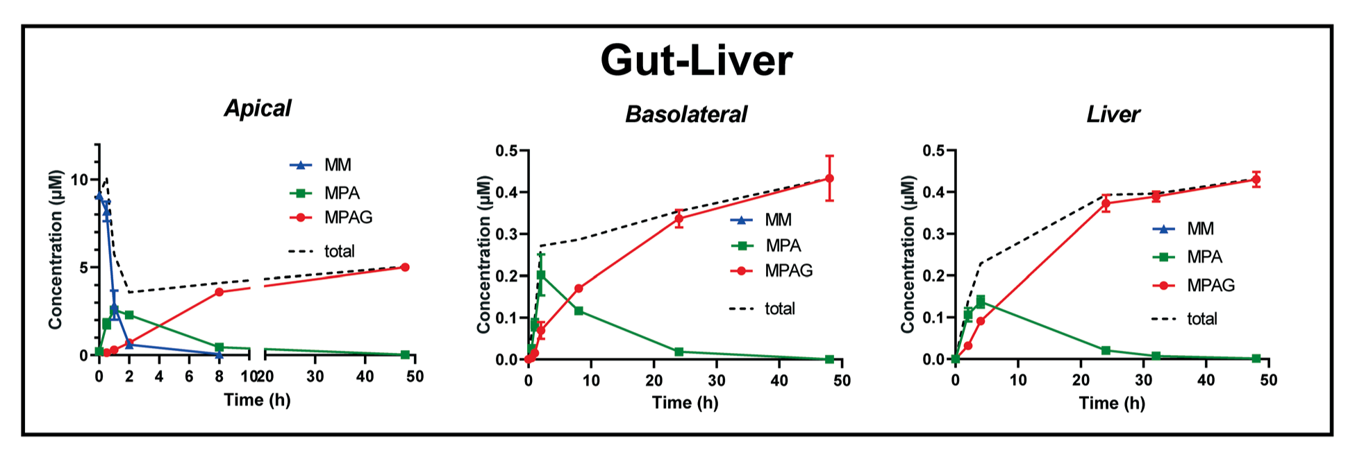 下面我们将展示三组系统对原药霉酚酸酯(MM)及其代谢物(MPA 和 MPAG)的时间浓度分析结果,每组系统分别在肠腔室顶侧(Apical)、肠腔室基底侧(Basolateral)和肝腔室取样分析。
