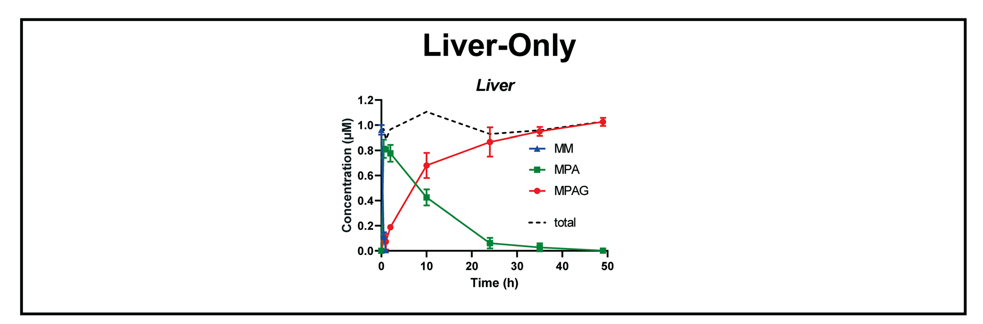 Fig.6 仅肝实验系统组,对原药霉酚酸酯(MM)及其代谢物(MPA 和 MPAG)的时间浓度进行三重分析