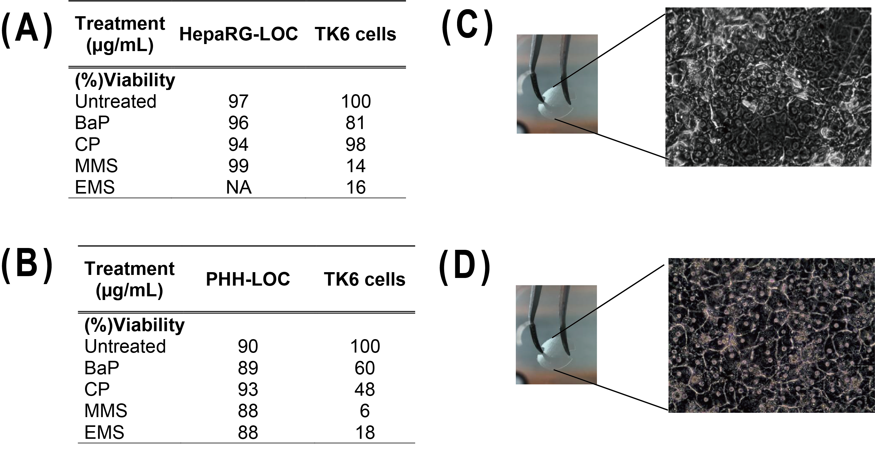(D)肝脏芯片(Liver-on-chip,LOC)与TK6细胞共培养的示意图,并说明如何将每种测定方法适应于该系统。该LOC由原代人肝细胞(PHH-LOC)或HepaRG细胞(HepaRG-LOC)以及TK6细胞组成。该系统允许两个隔室之间的通信,并进行多种终点分析,例如肝细胞中的彗星试验(% tail DNA intensity)和TK6细胞中的微核试验(使用MicroFlow试剂盒(Litron)进行流式细胞术)。两个LOC(包括细胞外基质、内皮细胞、PHH或HepaRG和Matrigel)均在CN-Bio的器官芯片系统技术下维持,TK6细胞在Transwell上进行培养。两个隔室分别在0、24和45小时时,使用阴性对照、直接诱变剂甲烷磺酸酯(5μg/mL的MMS)或间接诱变剂苯并[a]芘(10μg/mL的BaP)和环磷酰胺(50μg/mL的CP)进行处理,阳性对照使用变异诱导剂乙基甲磺酸酯(EMS)。进行了三次独立实验,并收集了肝细胞和TK6细胞。
