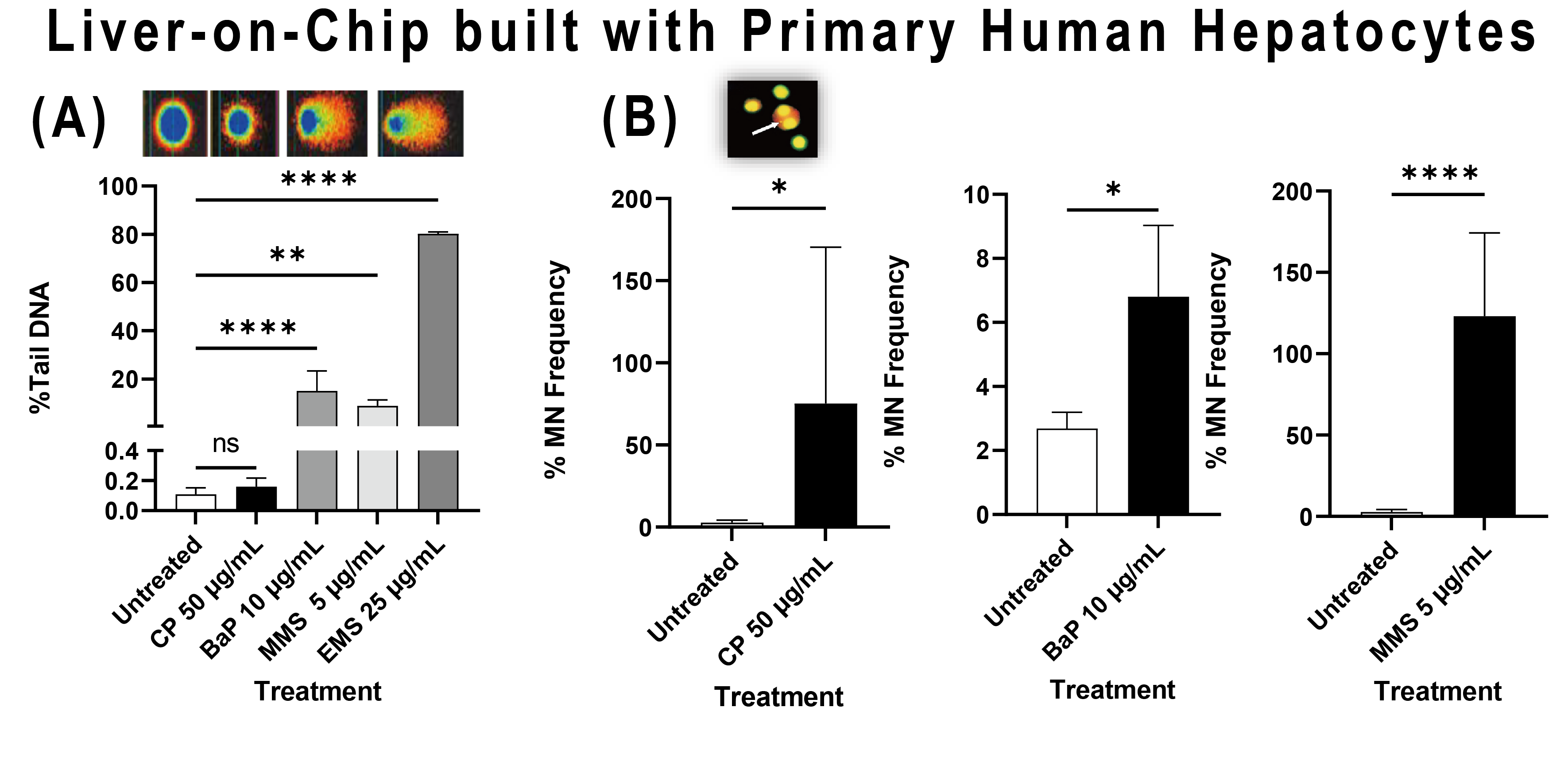 (B)在使用PHH构建的肝脏芯片的TK6细胞中进行的微核(MN)试验结果显示,微核水平(% MN频率)。统计分析采用t检验,其中 * p< 0.05 , ** p ≤ 0.005, **** p < 0.001。