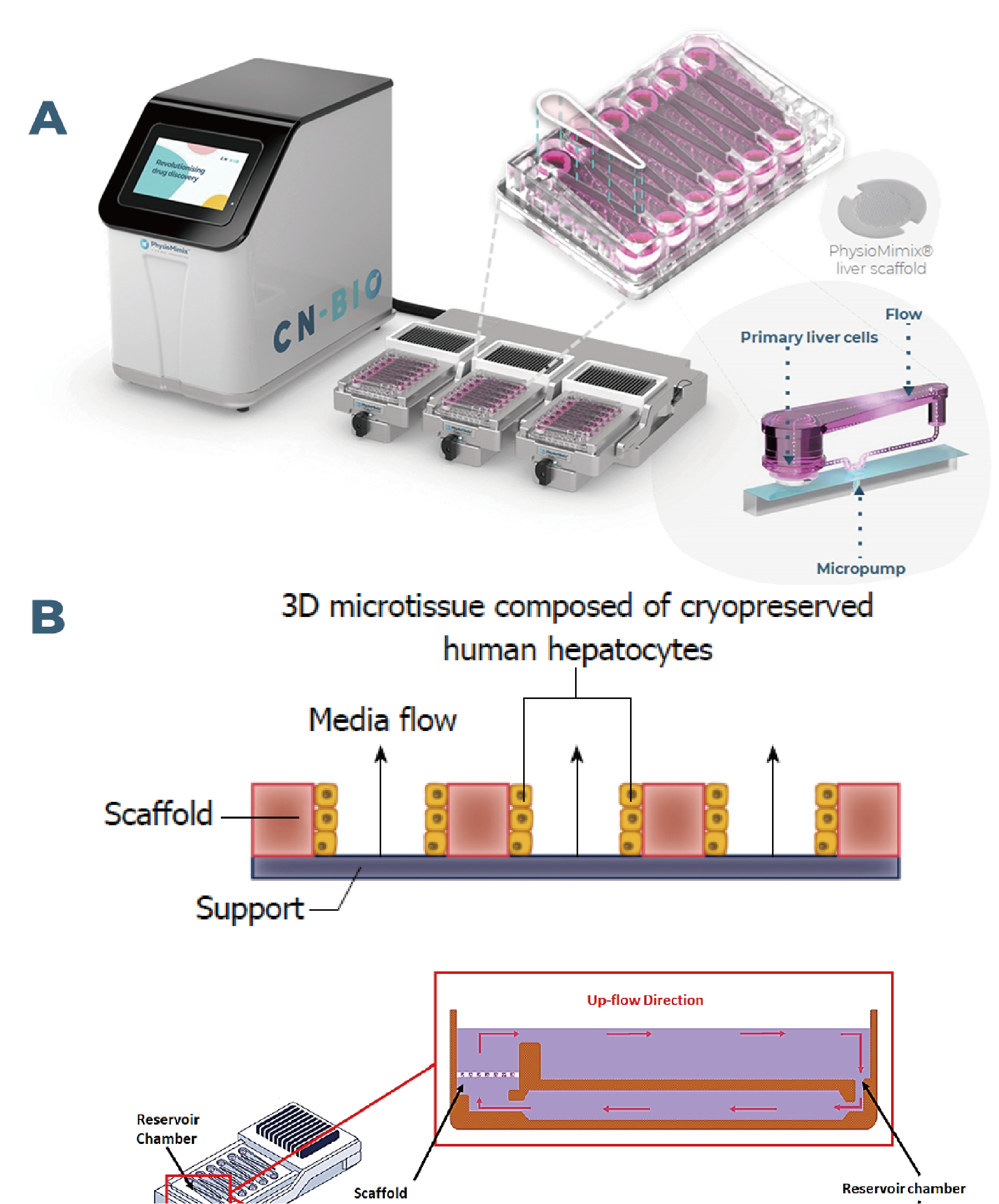 B:LC12 平板由一个支架组成,原代人类肝细胞播种在支架上,并在微通道内形成3D微组织。培养基在支架和储层中循环,不断提供流动。