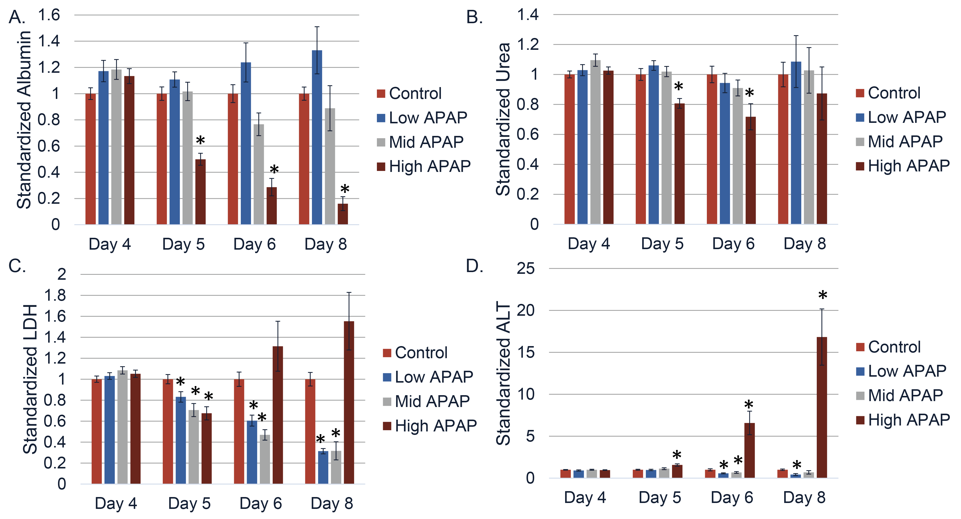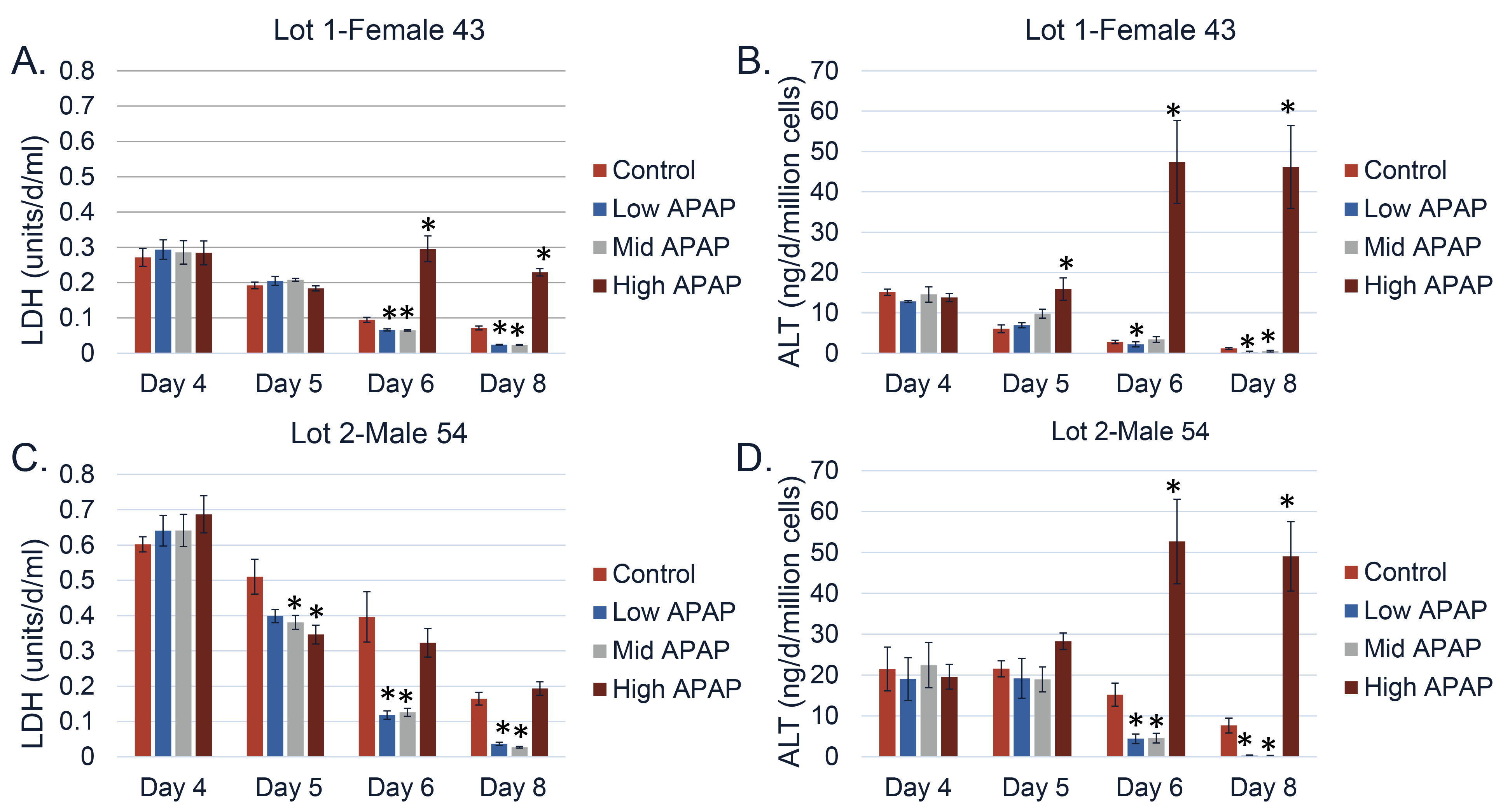 四个单一供体的平均数据显示在高剂量下有毒性,但在低剂量下失去了一些批次所见的敏感性。所有个体供体的标准化白蛋白在最高浓度下显示出毒性(3-A),但在低剂量下未能检测到批次1(1-A)所示的毒性。尿素(3-B)在最高的APAP剂量下显示出降低,但由于批次效应差异,在最后一天并未显示出降低。LDH(3-C)由于LDH释放的批次差异,并未在最高的APAP剂量下显示出增加。尽管批次之间存在变异,但ALT(3-D)在合并批次中强烈增加。(合并4个单一供体批次,每个批次进行2-3次实验,每个实验每种条件使用1-5个芯片。N=23-29。)(*)=p<0.05