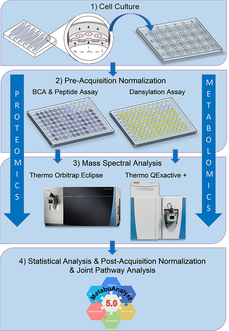 然而,这些器官芯片平台的一个常见问题是由于诸如板边效应、细胞不同步、流出液流等因素导致蛋白质组和代谢组在不同孔之间或不同芯片之间的变异性,这会导致样本的多组学定量分析具有高度的变异性,可能掩盖了系统内真正的生物学变化。虽然通过增加样本数(N)可以克服这种变异性,但这样做也会增加成本和人力。我们反而寻求改进我们的归一化方法来规避这个问题。