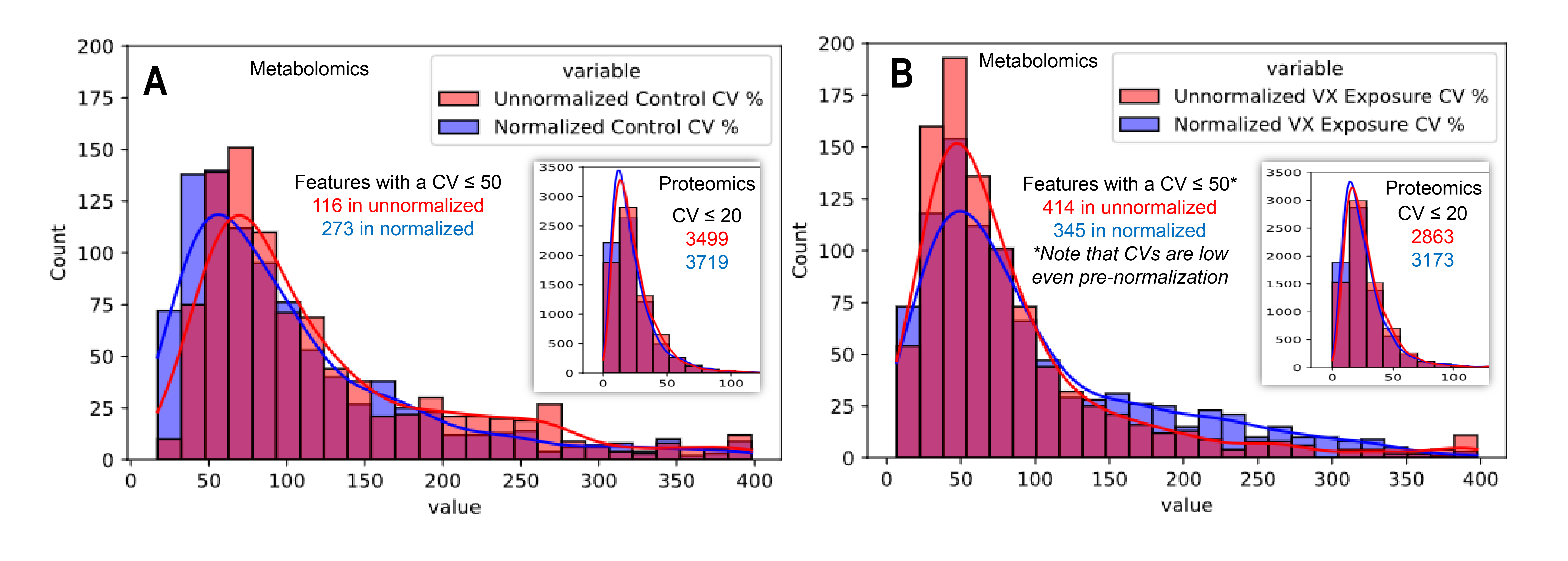 在采集数据之前对代谢组样本进行归一化处理,使对照样本在 0-50 范围内的 CV 值降低了两倍多。这样就能鉴定出变化更明显的代谢物,从而阐明受 VX 暴露影响的代谢途径。同样,归一化蛋白质组样本也鉴定出了与受 VX 影响的生化功能相关的蛋白质。